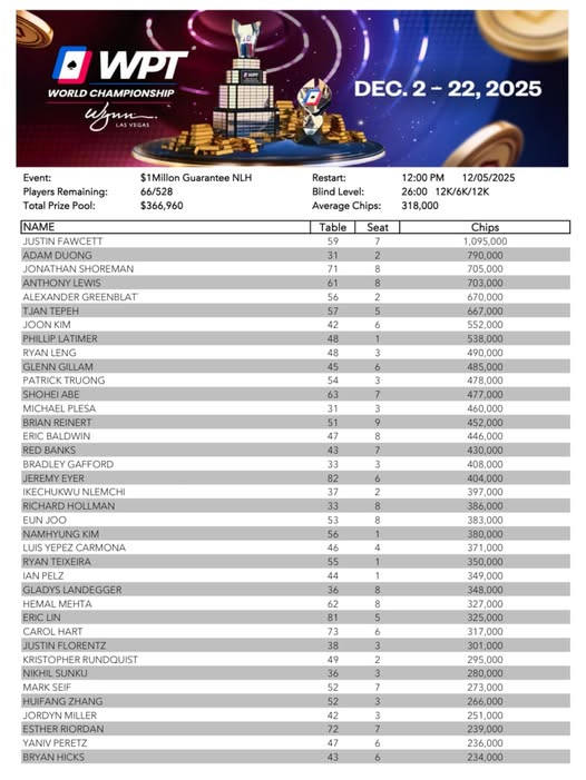 Hier sind die Top Chipcounts der Tag 1a & 1b: