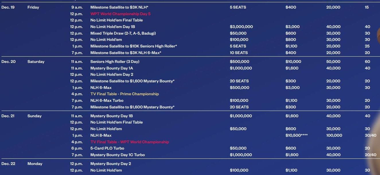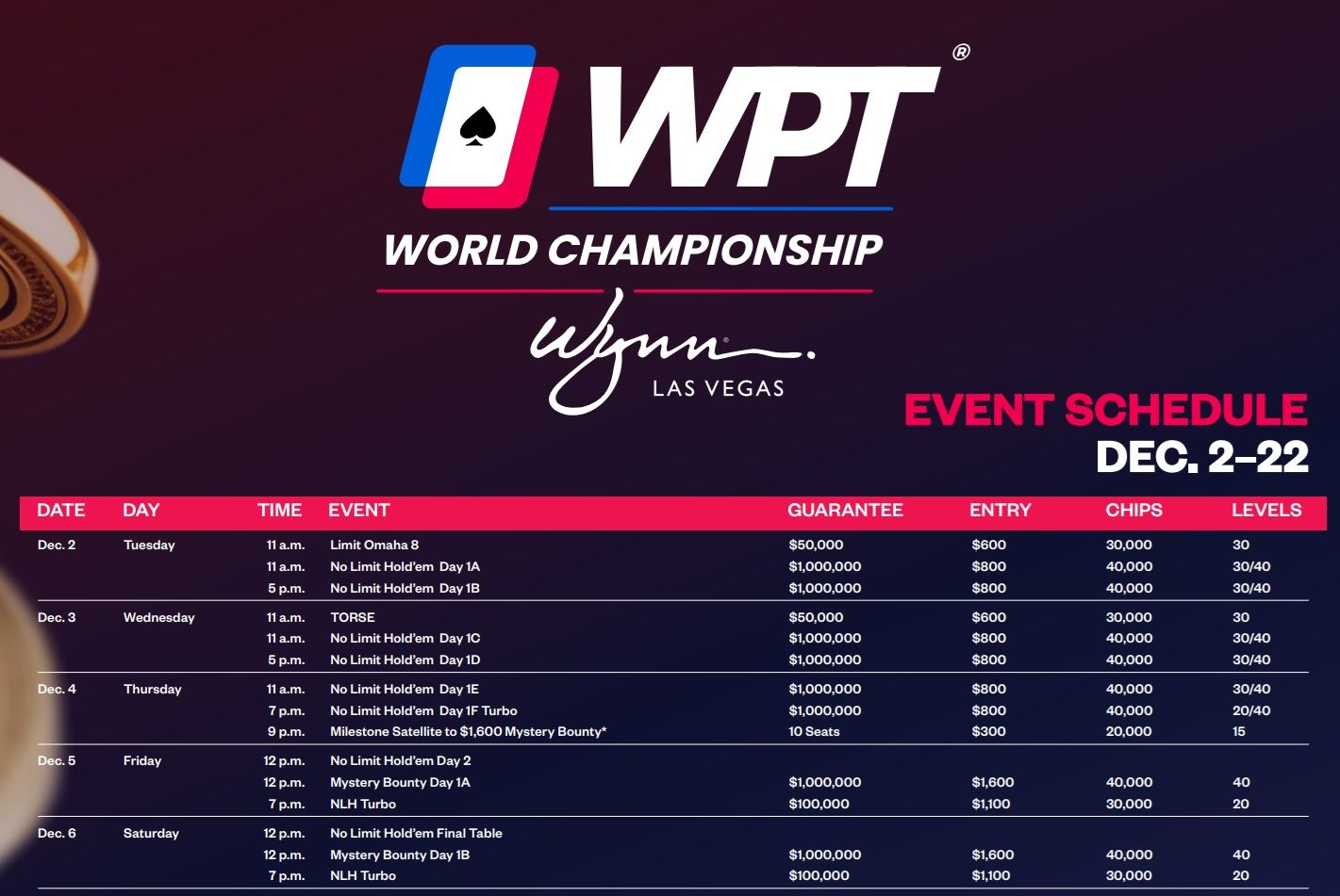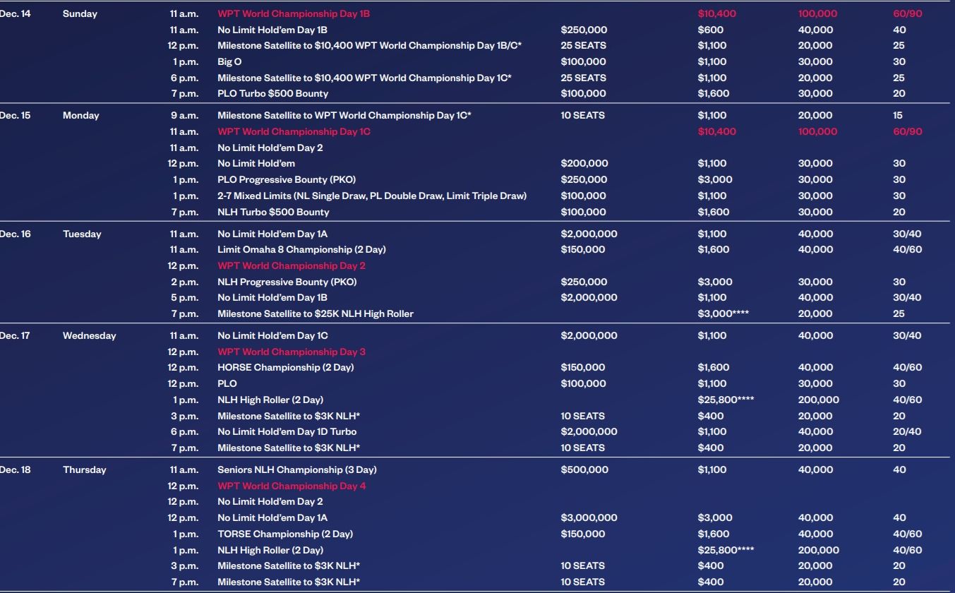 Höhepunkt ist natürlich wieder die titelgebende WPT World Championship mit einem Buy-In von $10.400, die in diesem Jahr ohne Garantie daherkommt. Sie wird vom 13. Dezember bis 19. Dezember ausgetragen.