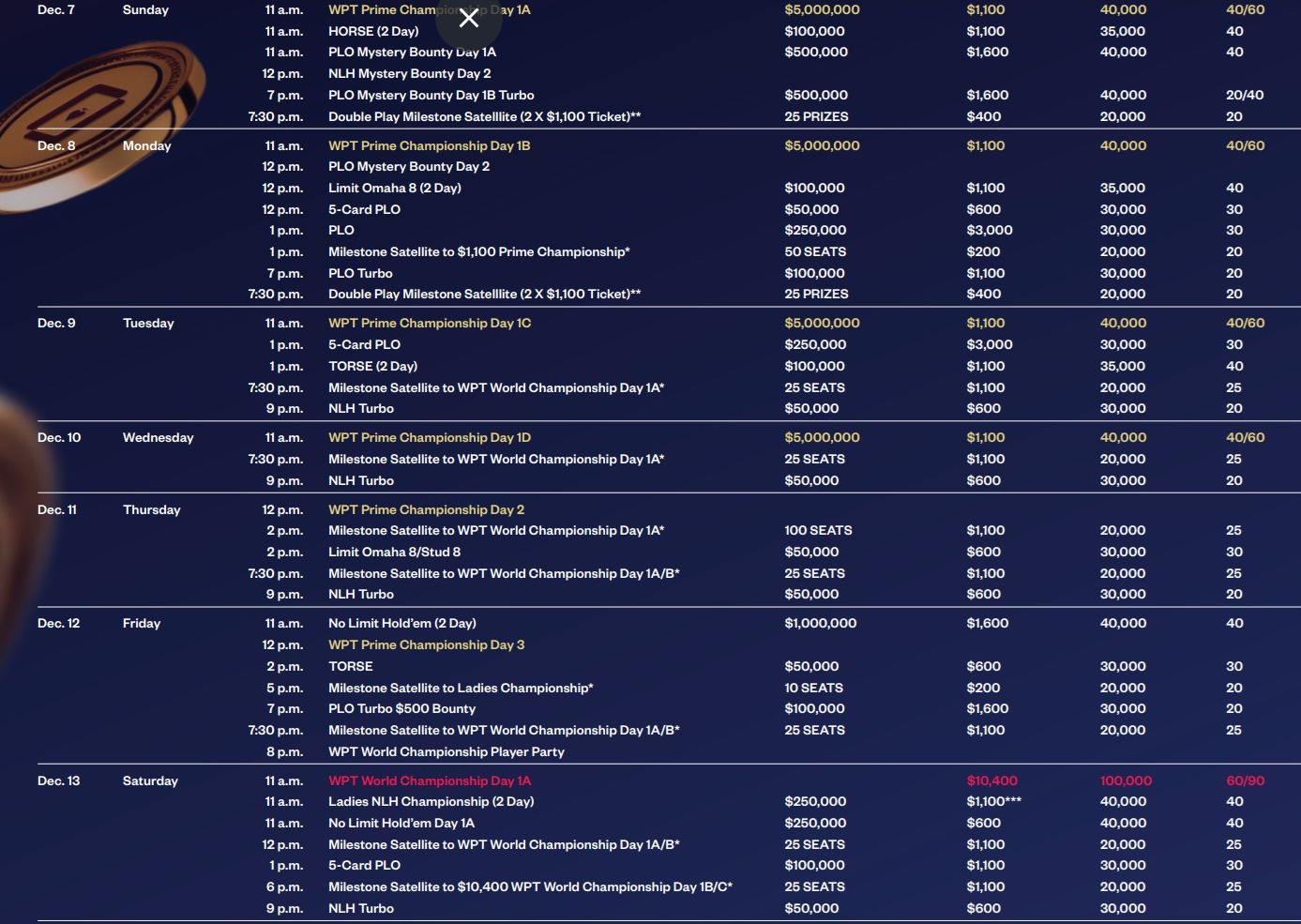 Anders sieht es bei der WPT Prime Championship aus, die vom 7. Dezember bis 12. Dezember stattfindet. Hier sind $5 Millionen Preisgeld garantiert, und das bei einem Startgeld von $1.100.