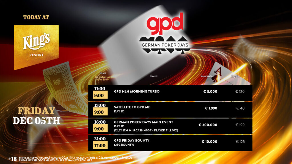 Im King’s Resort Rozvadov stand am gestrigen Donnerstag der zweite von sechs Starttagen der German Poker Days auf dem Programm. Für ein Startgeld von €199 wird bei diesem Turnier ein Preisgeld von €300.000 garantiert und es sind zehn Packages für das King’s Million European Championship im Wert von jeweils €3.000 im Preis enthalten.