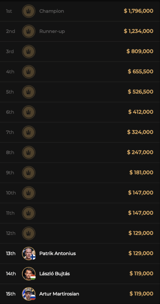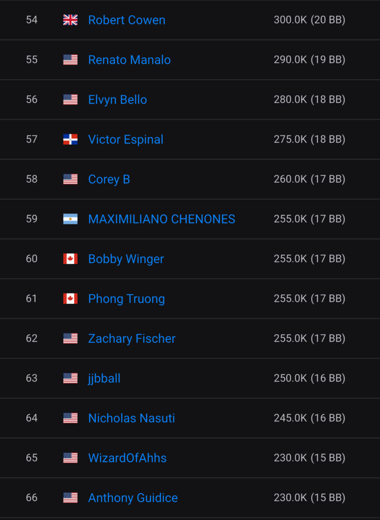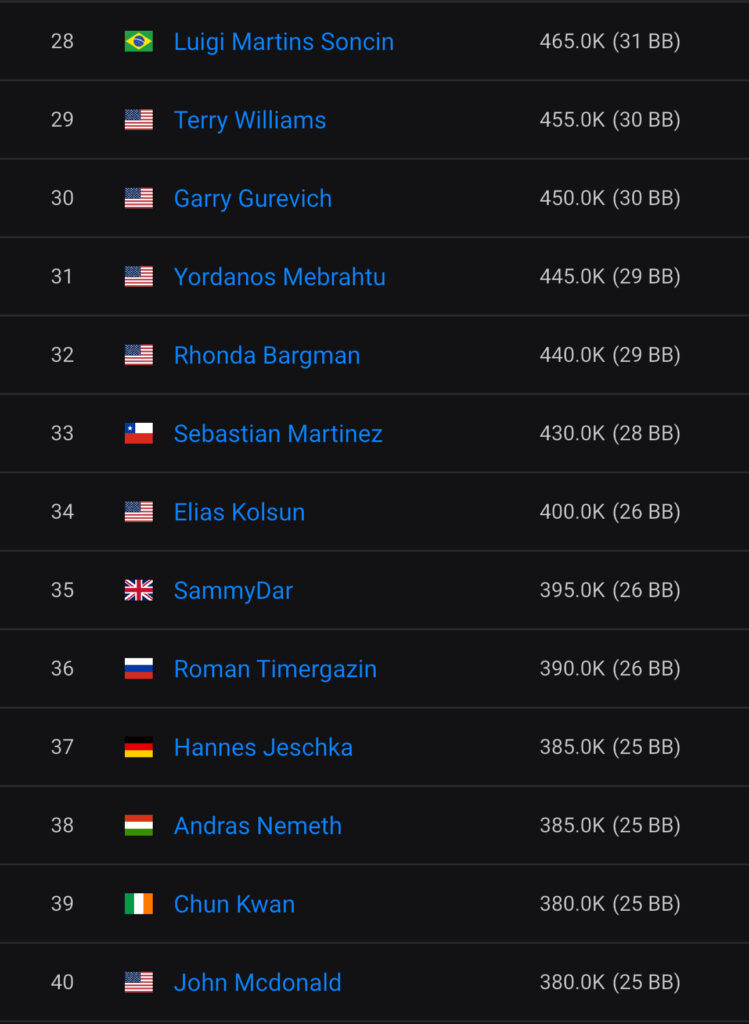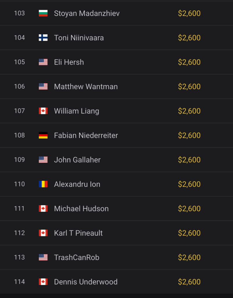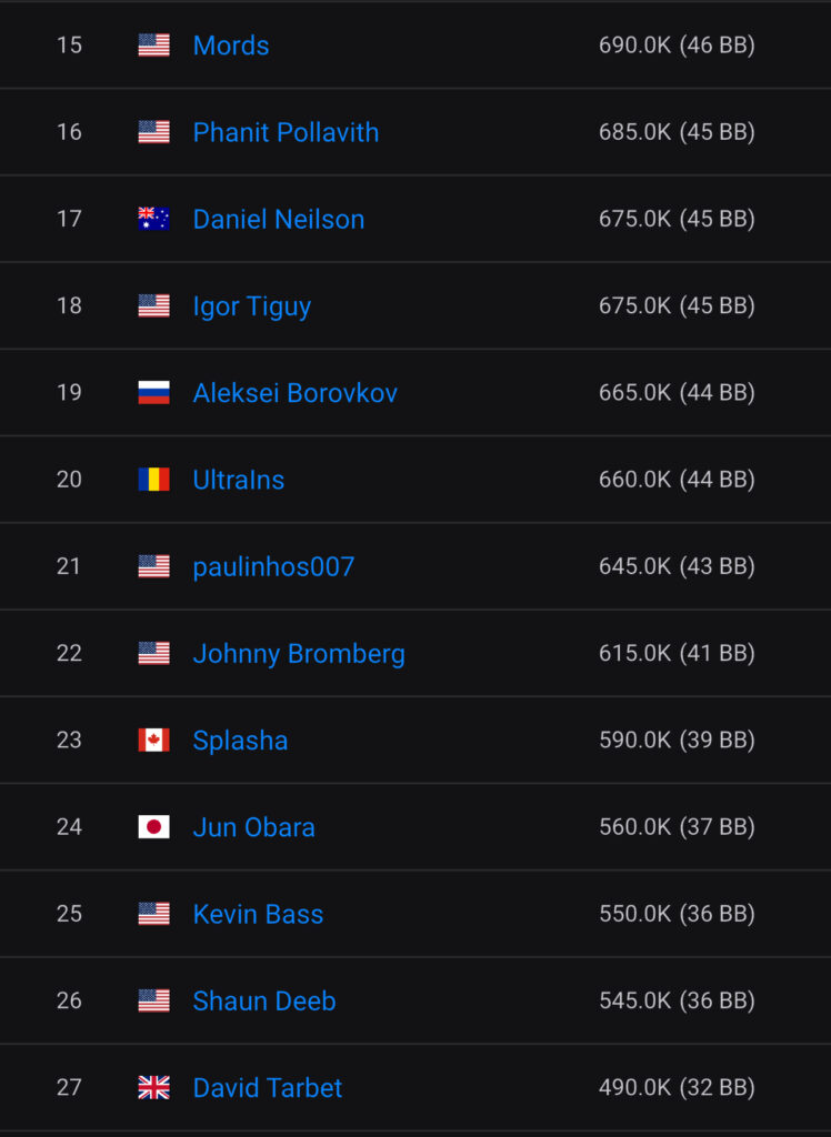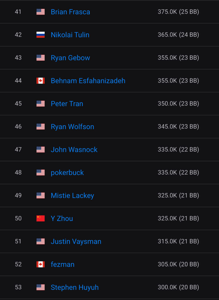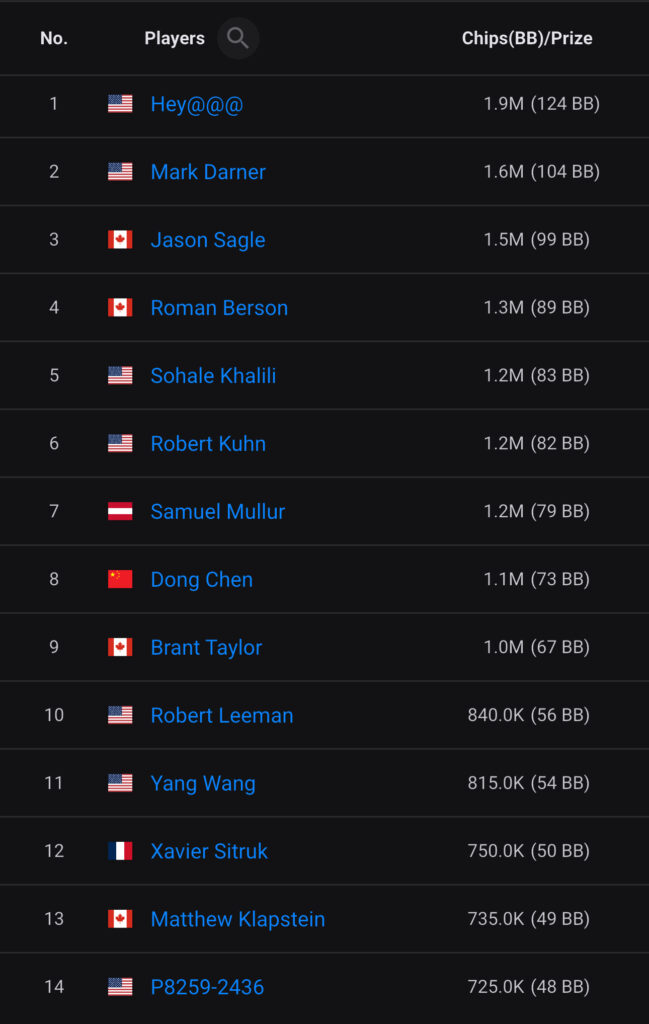 Der Tag 1 wurde nach 15 Levels beendet und da waren es noch zwölf Spieler, die Chips vor sich stehen hatten und somit heute für das Finale zurückkehren werden. Der einzige DACH-Spieler, der sich für dieses Event angemeldet hatte, war der Österreicher Matthias Eibinger. Er war es auch tatsächlich, der am Ende des Tages am meisten Chips eintüten konnte und heute als Chipleader an den Start gehen wird.