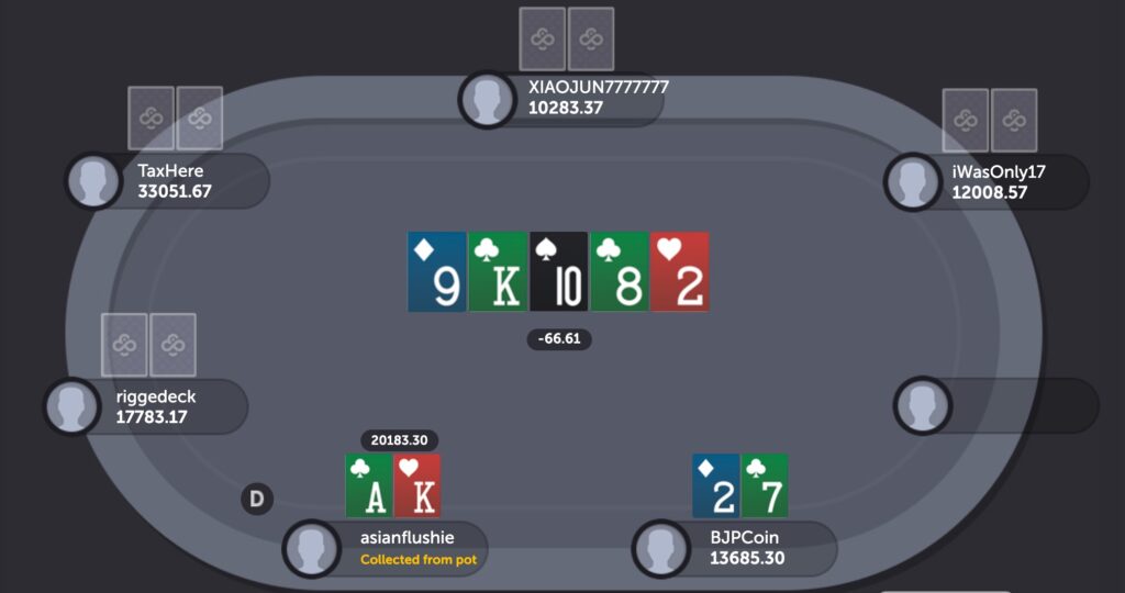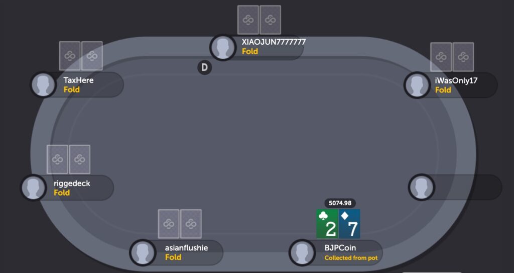 Während in den vergangenen Wochen beim 7-2 Game standardmäßig vor dem Flop, oder spätestens mit der Conti-Bet auf dem Flop, der Extra Prize Pool klar gemacht wurde, hatte auch hier Bobby James in der 3. Ausgabe des HS CGWC VIP Games andere Pläne. Seine Kontrahenten gaben ihre Vorhaben auf, sobald sie auf Gegenwehr stießen, doch „The BJP“ zog auch hier bis zum River durch. Dass das Ganze gegen Bjorn „asianflushie“ Li, der mit AKo direkt das Top Pair floppte, nicht nur zum Scheitern verurteilt, sondern für „BJPCoin“ mächtig teuer war, könnt ihr hier selbst sehen: