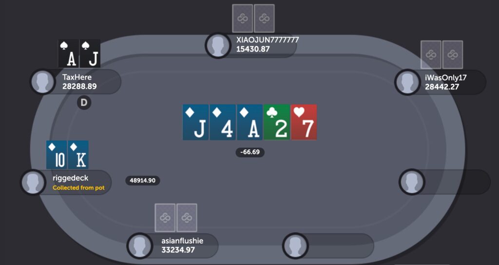 In der dritten Ausgabe während der HS CGWC war „Bobby James Poker“ der eingeladene VIP. Unter seinen 5 Kontrahenten waren nicht weniger namhafte Spieler: Mit Bjorn „asianflushie“ Li saß einer der High Stakes Regulars und gefürchtetsten Cash Game Spieler der Online Pokerwelt mit am Tisch. Gleiches kann man sicher auch über Barak „IWasOnly17“ Wisbrod sagen. Nicht weniger gefährlich, dafür primär unter ihren Online Sreennames bekannt waren am Sonntag „XIAOJUN7777777“ und der hochfrequent in der CGWC spielende „TaxHere„. Mit „riggedeck“ war außerdem einer der heißesten Anwärter auf den Weltmeistertitel der CGWC am Start!