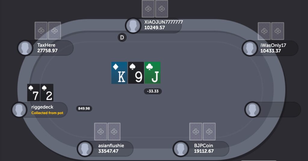 Das VIP Game findet während der High Stakes Cash Game World Championship immer sonntags ab 19:00 Uhr auf CoinPoker statt. Gespielt wird in der Regel 2 Stunden, außer die Teilnehmer vereinbaren untereinander einen längeren Zeitraum. Derzeit wird das VIP Game 6- oder 7-handed mit $10.000 Buy-In bei Blinds $50/$100 mit $33,33 Ante gespielt. Das VIP Game findet an einem Tisch mit der „Show“-Regel statt. Das bedeutet, dass die gewinnende Hand immer für die Gegner am Tisch und damit natürlich auch für die Zuschauer gezeigt wird, ganz egal, ob es zu einem Showdown gekommen ist oder nicht. Darüber hinaus wird das 7-2-Game gespielt, für das jeder Spieler immer 5 BBs, also $500, vor sich liegen hat, die automatisch jedes mal an die Person am Tisch geht, die mit der schlechtmöglichsten Starthand, 7-2, eine Hand gewinnen konnte. – Anschauen kann man sich das Ganze live als Railbird im CoinPoker Client an dem entsprechenden Tisch, live auf dem Twitch- oder YouTube-Kanal der CoinPoker Streamer, oder als Video-Zusammenfassung auf den YouTube-Kanälen „CoinPoker_TV“ oder „BobbyJamesPoker„.