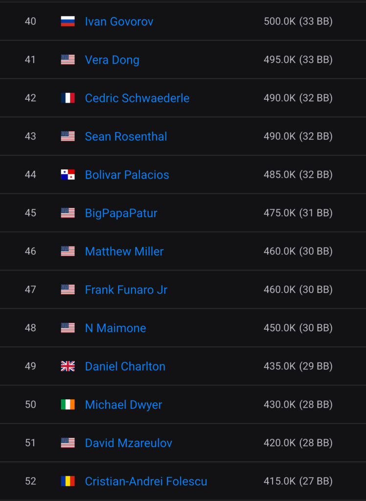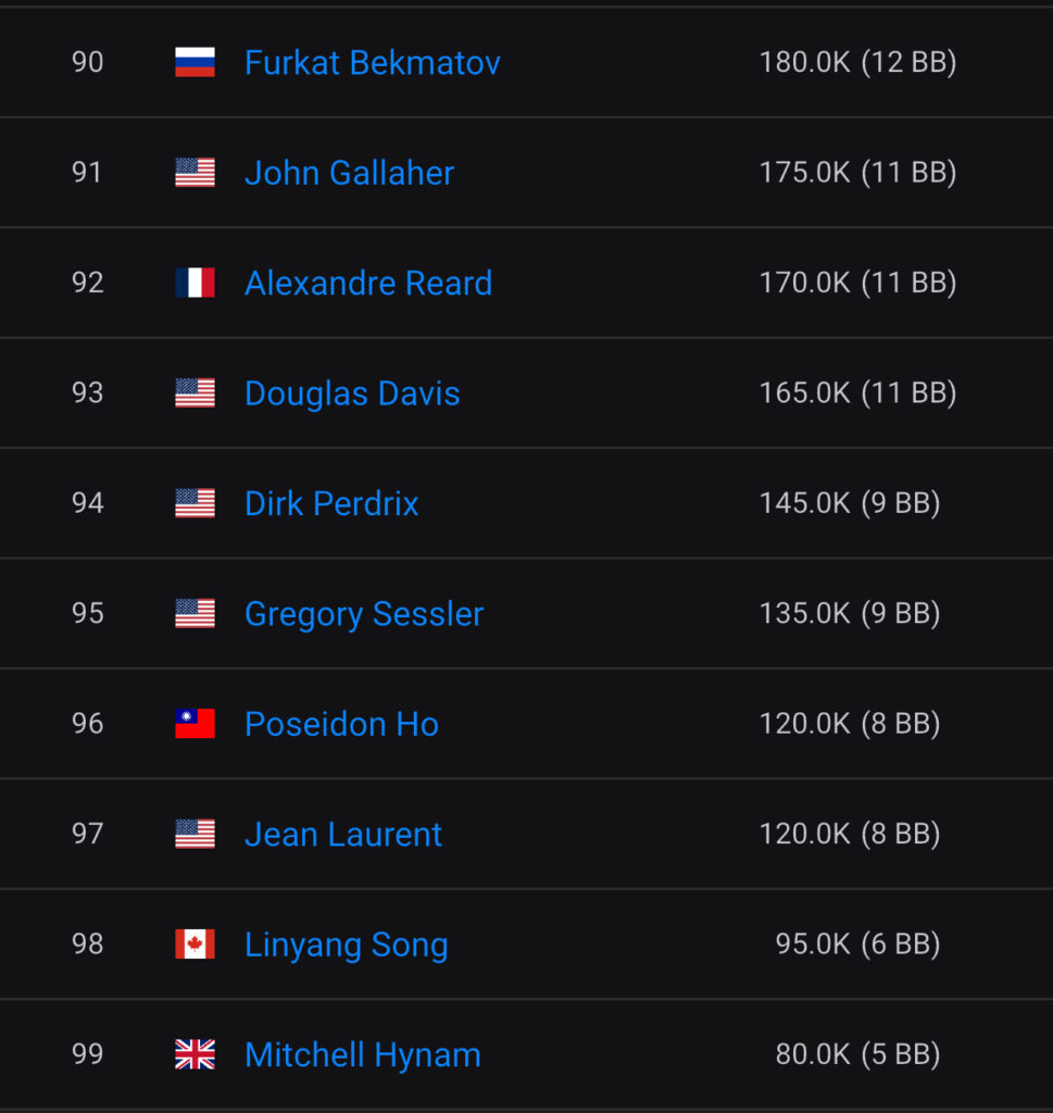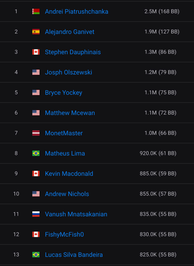 148 Spieler waren an Tag 1C im Geld und am Ende verblieben 99 Spieler für den heutigen Tag 2. Am meisten Chips gingen dabei für den Weißrussen Andrei Piatrushchanka in die Tüte und er hat somit die besten Ausgangschancen auf den $199.300 Top-Preis und die Bounties.