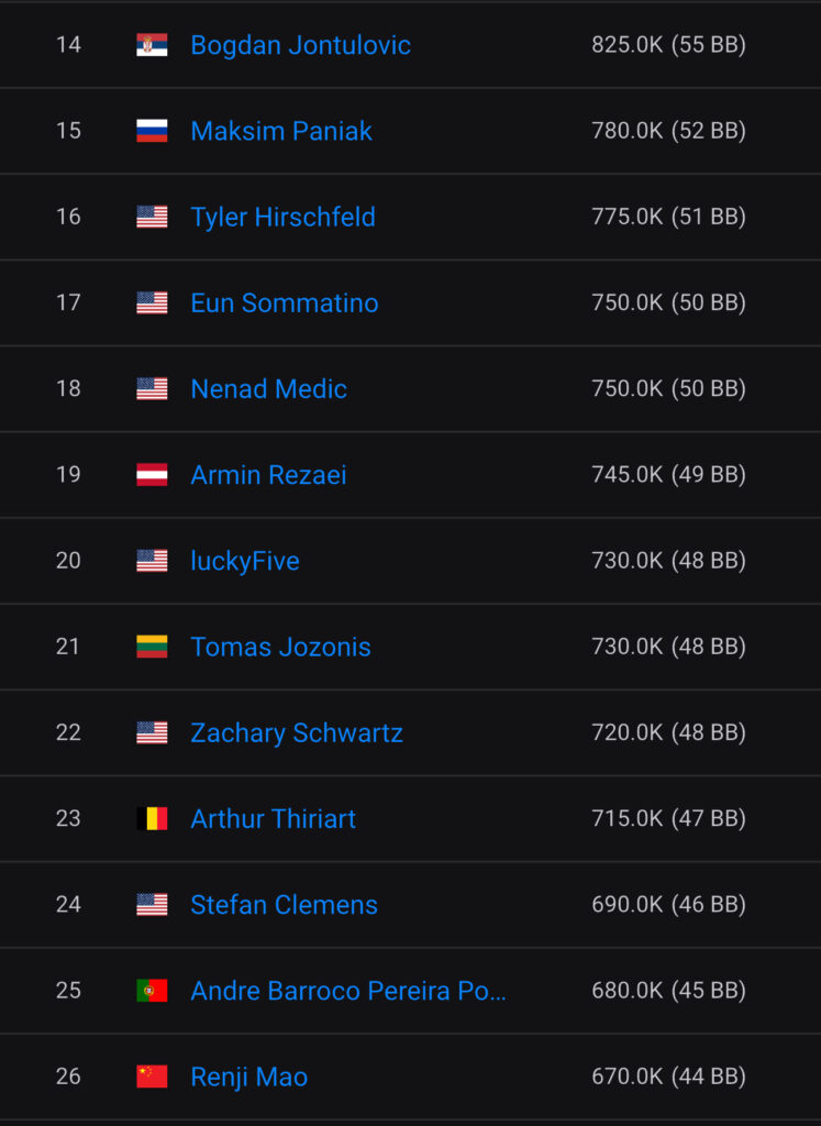 Aus DACH-Sicht hat der Österreicher Armin Rezaei die Nase vorn. Er befindet sich auf Rang 19 in Chips aus Tag 1C. Felix Rabas (AT) ist auf Rang 28, Artur Kraus auf Rang 31, David Kaufmann (DE) auf Rang 74, Leonard Herrmann (DE) auf Rang 85 und Timo Eckert (DE) auf Rang 89.
