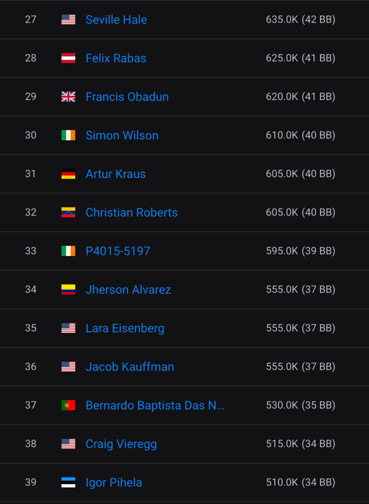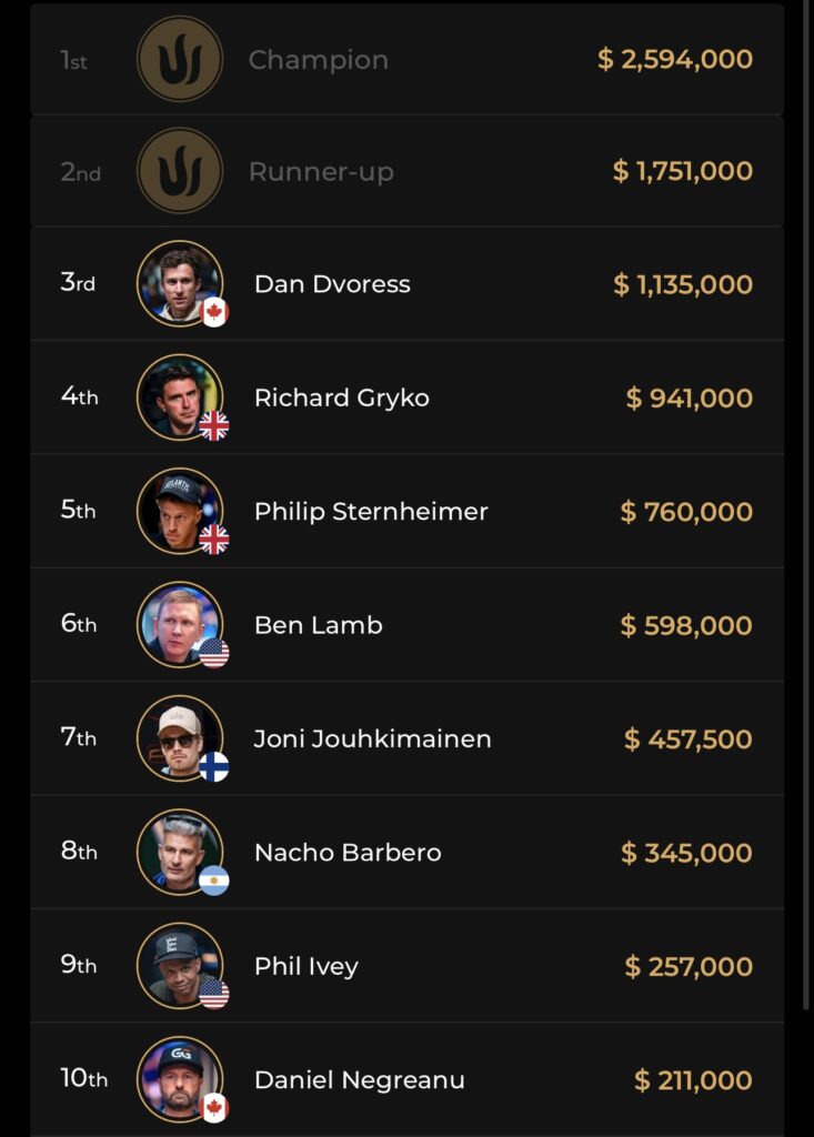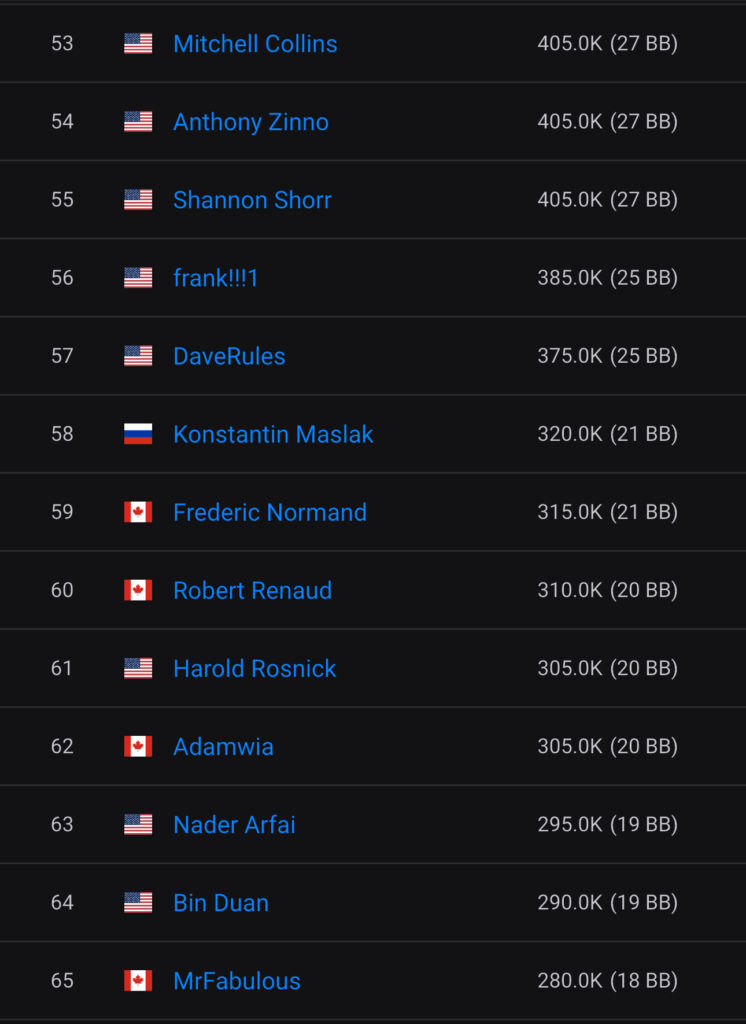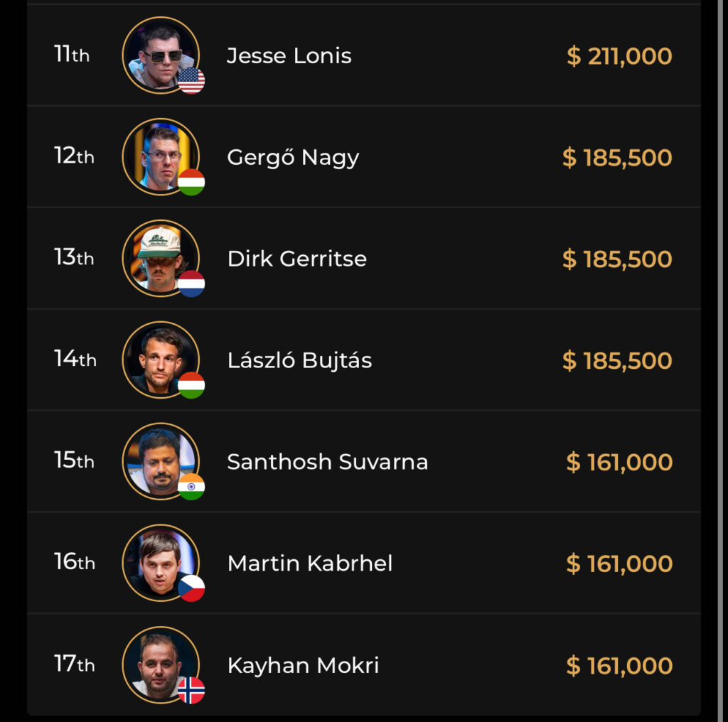 17 Spieler wurden bezahlt und leider schafften es weder Phil Ivey (Platz 9 – $257.000) noch Daniel Negreanu (Platz 8 – $211.000) an den Finaltisch.