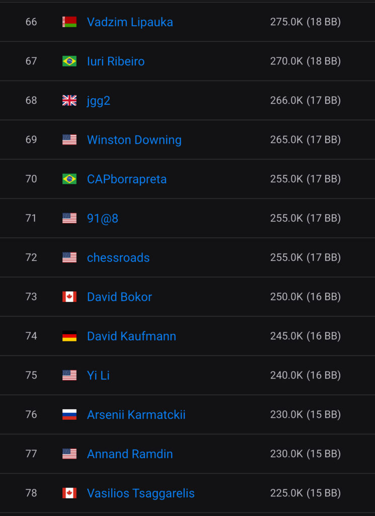 Hier die kompletten Chipcounts aus Tag 1C: