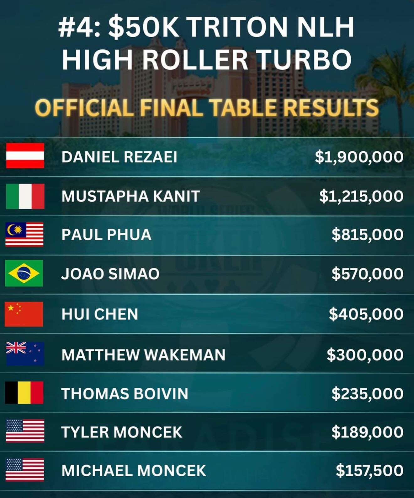 | 7-Dec | $250,000 | Event #5: Triton Invitational NLH |