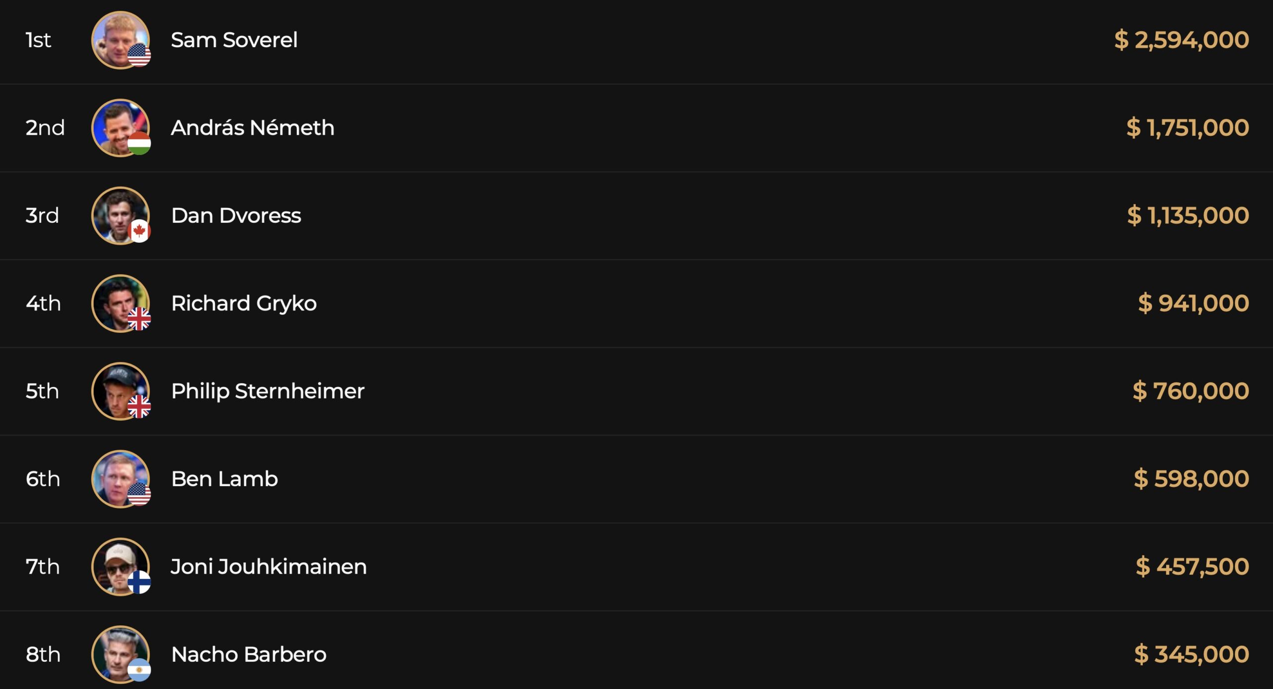Wer schon immer einmal sehen wollte, wie man in 15 Minuten 2 Titel gewinnt, war an den Rails von Event #3 genau richtig. Keine 15 Minuten dauerte es, bis der hyperaggressiv spielende Chipleader Sam Soverel, die ungarische Online-Legende bezwungen hatte. Damit nahm der US-Amerikaner neben den beiden Titeln noch $2.594.000 mit nach Hause, was eine neue Highscore für den High Roller ist. Das gleiche galt auch für die $1.751.000 Runner-Up Prämie, die Andras Nemeth kassieren konnte.