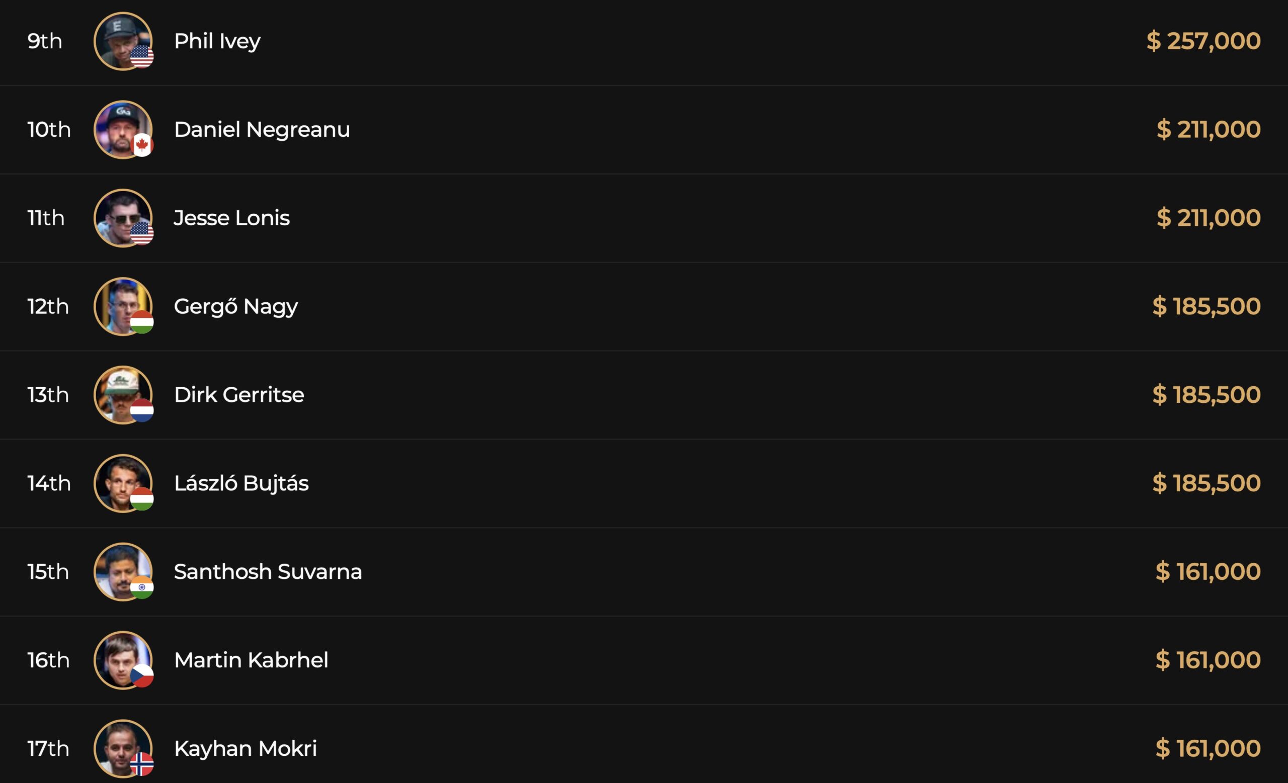 Von den heimischen Spieler*innen weiter erfolgreich dabei sind Christoph Vogelsang (GER, 63., 228.000), Manuel Fritz (AUT, 43., 348.000) und Leon Sturm (GER, 20., 673.000). Die 3 D-A-CH-Ler werden heute weiterhin auf jede Menge Pokerikonen treffen, so wie es in einem Triton Invitational Gang und Gebe ist: Patrik Antonius (FIN, 69., 90.000), Örpen Kiscikoglu (TUR, 68., 112.000), Paul Phua (MAS, 66., 161.000), Artur Martirosian (RUS, 65., 191.000), Joao Simao (BRA, 235.000), Kristen Foxen (CAN, 60., 246.000), Jared Bleznick (USA, 55., 268.000), Thomas Boivin (BEL, 51., 297.000), Alex Kulev (BUL, 49., 300.000), Adrian Mateos (ESP, 41., 373.000), Daniel Negreanu (CAN, 34., 421.000), Philipp Sternheimer (GBR, 33., 434.000), Nacho Barbero (ARG, 32., 437.000), Nick Schulman (USA, 29., 476.000), Stephen Chidwick (GBR, 18., 754.000), Mikita Badziakouski (BLR, 15., 819.000) oder Titelverteidiger Alejandro Lococo (ARG, 22., 636.000) sind nur einige der verbleibenden Big Names.