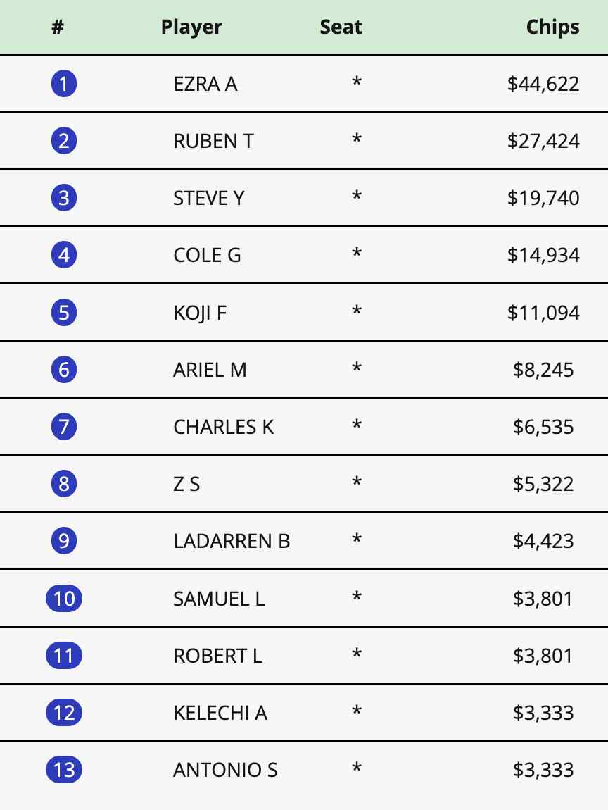 Am Ende konnte sich Ezra A. für $44.622 vor Ruben T. durchsetzen. Platz 2 ging mit $27.424 aus dem Turnier.