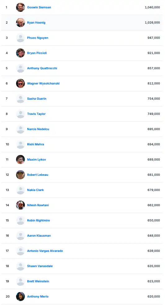 Der Sieg ging an Jonathan B. für $90.837. Christopher C. wurde Runner-Up für $57.543.