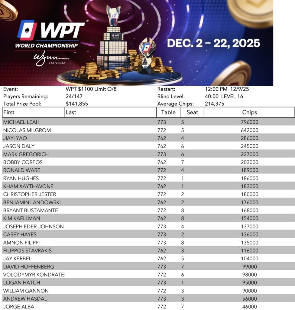 Schlechter als von Position 1 scheint Poker Pro Mike Leah in keinen Day 2 zu gehen. Der kanadische WSOP Braceletgewinner und WPT Tiotelträger hatte bereits Tag 1A vom WPT Prime Championship als Chipleader beendet. Der erfahrene Allrounder, der bereits 4. der Poker Player’s Championship wurde, ließ auch im Limit Omaha 8-or-better Event seine Muskeln spielen und powerte mit 796.000 Chips durch Tag 1 des 2-Day-Events an die Spitze. Noch in Schlagdistanz folgt Nicolas Milgrom auf Rang 2. Alle weiteren Spieler wie der Drittplatzierte Jiayi Yao besitzen mit 286.000 Chips und deutlich weniger nur einen Bruchteil der beiden Big Stacks.