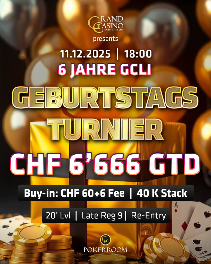 Ab 18:00 Uhr wird heute im GC Pokerroom gefeiert, und zwar der Gaburtstag des Grand Casinos Liechtenstein mit dem Geburtstagsturnier. Zum 6. Jahrestag lässt sich das GCLI nicht lumpen und spendiert 6.666 Schweizer Franken im garantierten Preispool. Um den kann mit 20.000 Starting Chips in 20-minütigen Leveln, und Re-Entry Option in den ersten 9 davon, gepokert werden. Das Startgeld beträgt passend dazu 60+6 CHF.