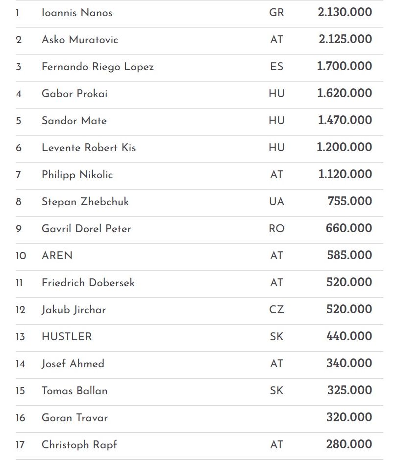 66 Spieler haben den Sprung in Tag 2 am Sonntag bereits geschafft, Chipleader ist der Georgier Gio Odishvili mit 2,875 Millionen Chips.