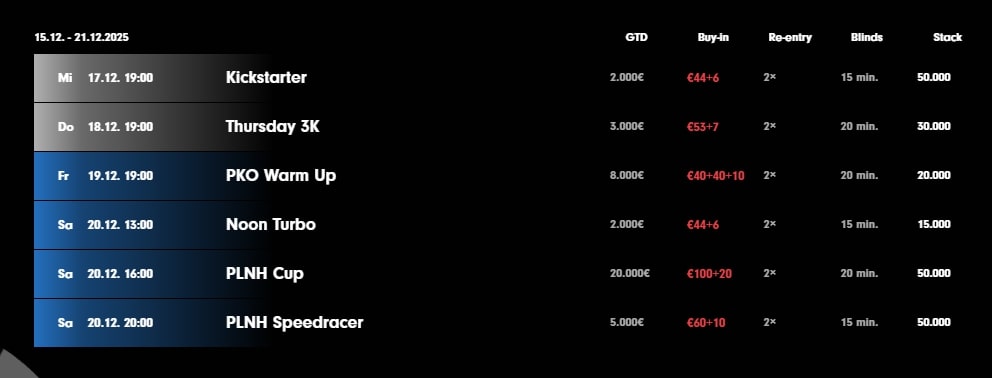 Los geht es am Mittwoch und Donnerstag ganz klassisch mit dem €44+6 Kickstarter und dem €53+7 Thursday 3k, wo €2.000 bzw. €3.000 Preisgeld garantiert werden.