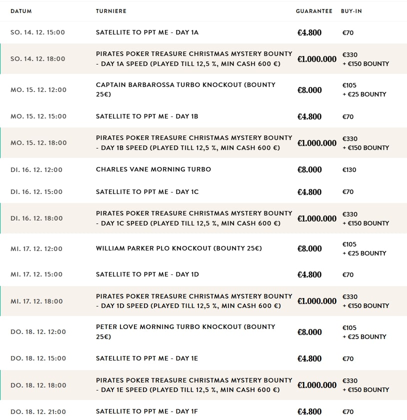 Dazu kommen zahlreiche Side-Events: Das €130 Captain Barbarossa Turbo Knockout mit €8.000 Garantie, sowie mit gleichem Buy-In und Garantie das Charles Vane Morning Turbo, das William Parker PLO Knockout und das Peter Love Morning Turbo.