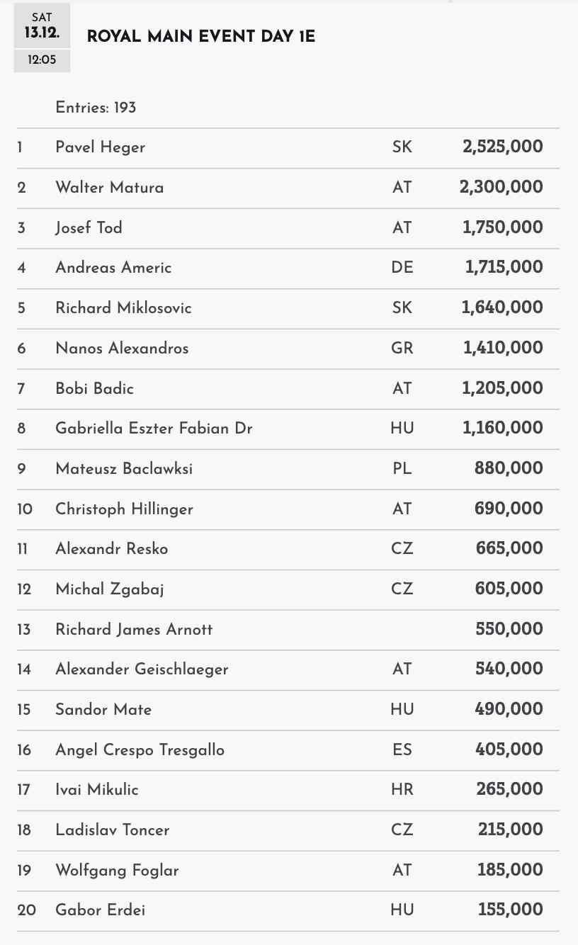 In Flight 1e waren 193 Entries am Start. 20 davon machten den Schnitt in Tag 2, Pavel Heger aus der Slowakei hatte mit 2,52 Mio. Chips die meisten Chips am Ende der Level.