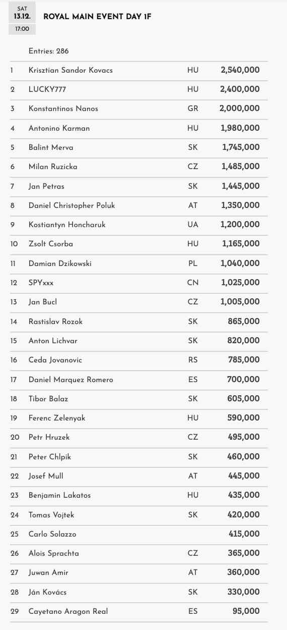In Flight 1f kamen 286 Entries dazu. Hier war es Krisztian Sandor Kovacs aus Ungarn mit 2,54 Mio. Chips, der am erfolgreichsten war.