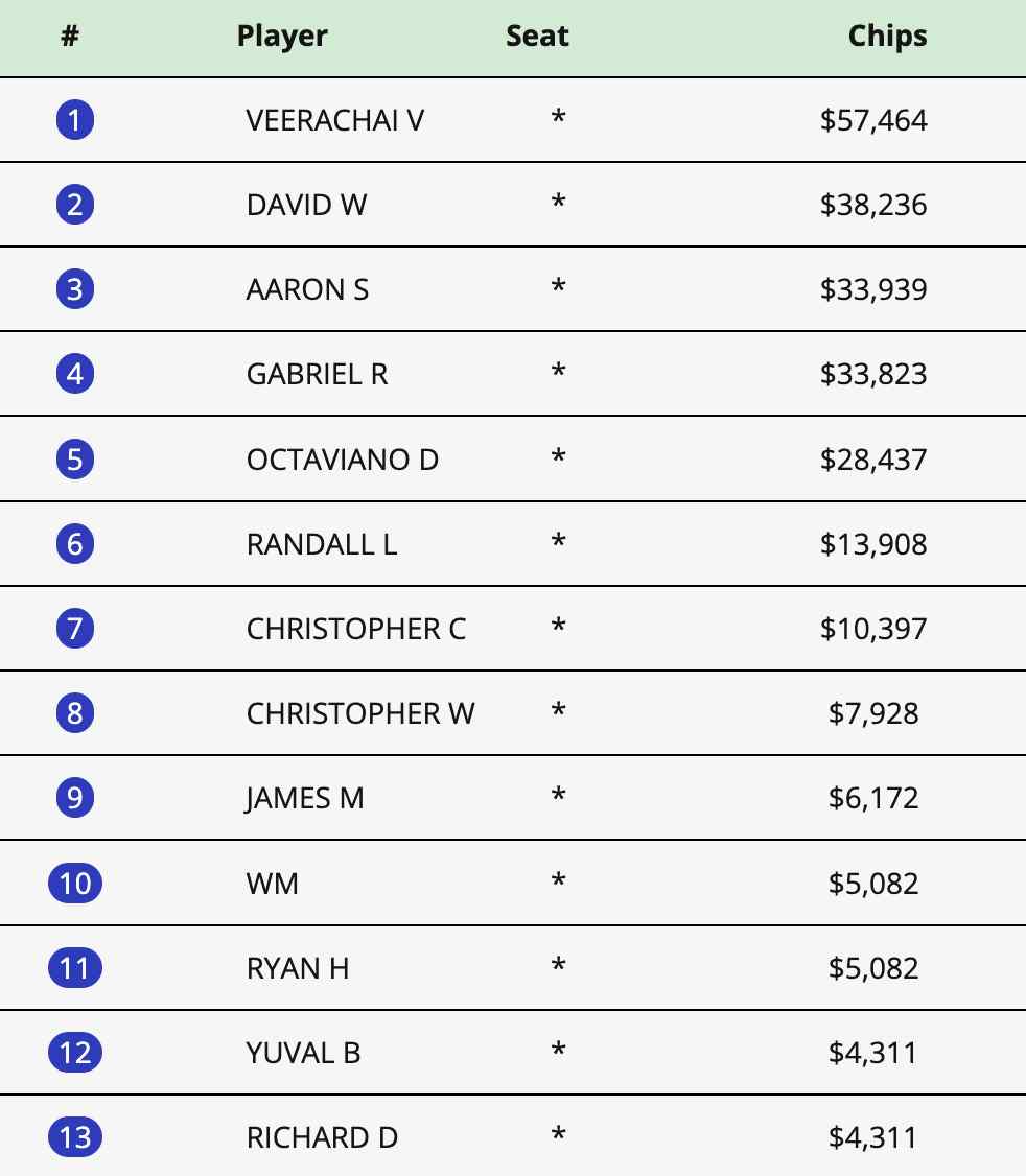 Der Sieg ging an Veerachai V. für €57.464 vor David W., der als Runner-Up mit $38.236 aus dem Turnier ging.