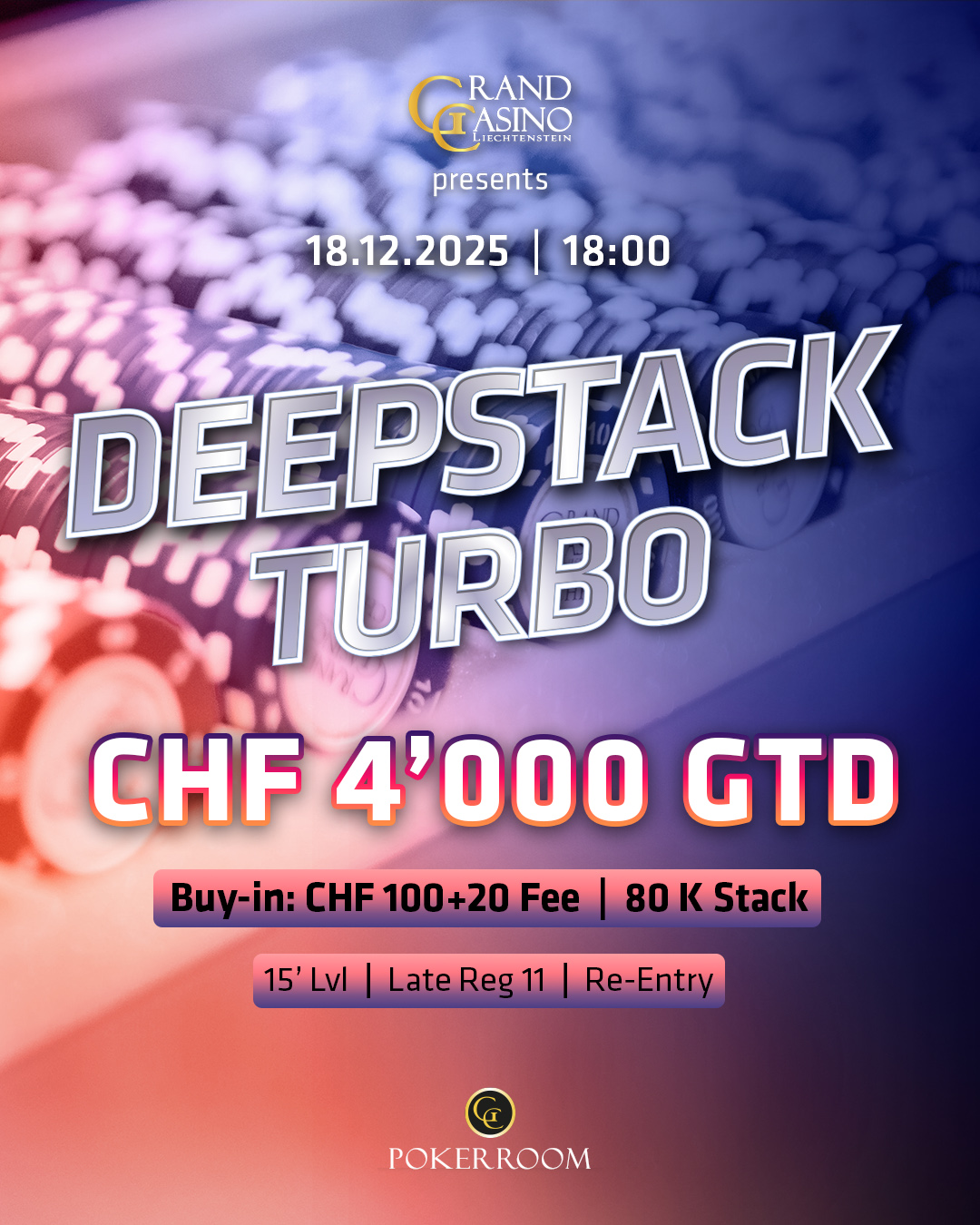 Heute geht es im Grand Casino Liechtenstein weiter mit dem traditionellen CHF 100+20 Deepstack Turbo. Gespielt wird mit einer CHF 4.000 Garantie, 80.000 Start Stack und 15 Minuten Blind Levels.