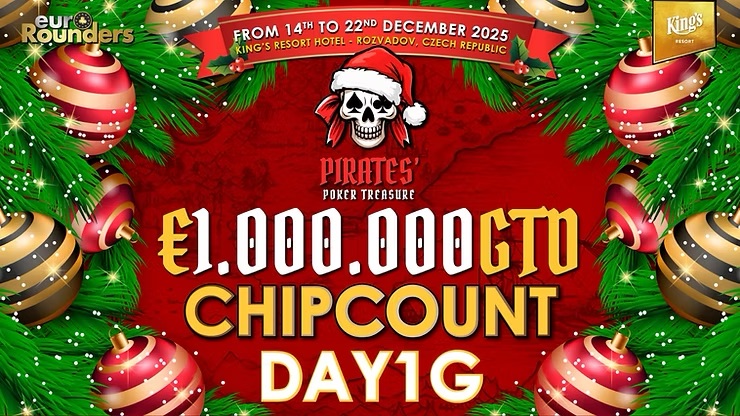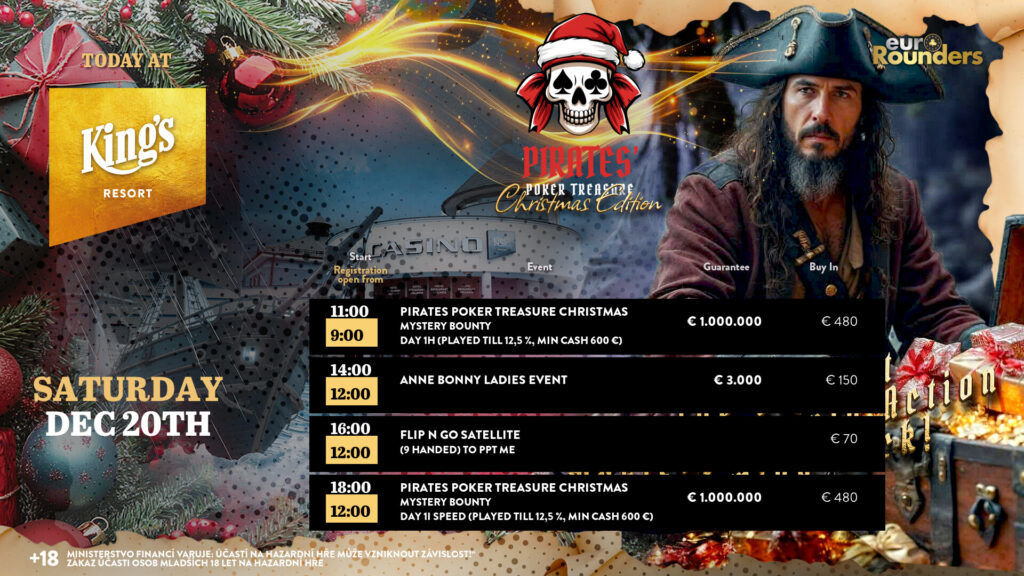 Die Flights 6 und 7 von insgesamt 10 wurden am Freitag beim Pirates Poker Treasure Christmas Mystery Bounty Main Event powered by euroRounders ausgetragen. Dabei kamen in dem Turnier mit €1.000.000 Garantie 315 Entrys im King’s Resort Rozvadov zusammen. Neben der Quali für Tag 2 des 3-Day-Events und dem damit verbundenen €600 Min-Cash ging es auch noch um den Chipleader Bonus in Höhe von €1.150 für den skrupellosesten Freibeuter. – Währenddessen sieht es im Main Event danach aus, dass es zu einem riesigen Overlay kommen könnte. Vor den letzten 3 Flights ist gerade einmal ein Viertel der Garantie eingespielt.