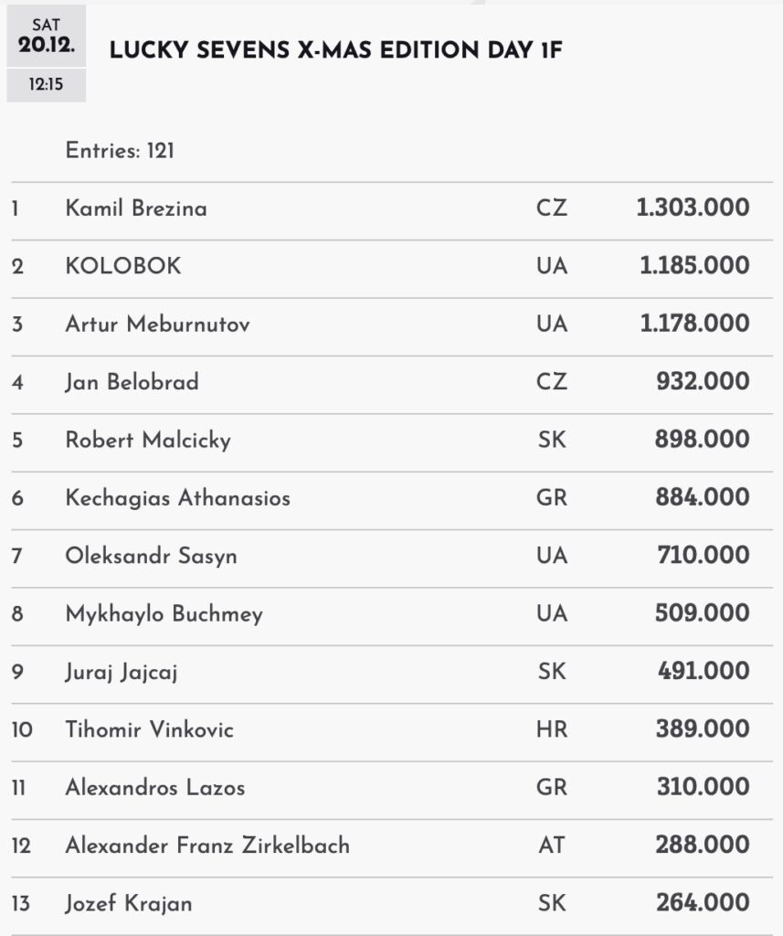 Den Chiplead holte sich der Tscheche Kamil Brezina mit 1.303.000 erspielten Jetons, vor den beiden anderen Chipmillionären „KOLOBOK“ und Artur Meburnutov (beide UKR), die 1.185.000 bzw. 1.178.000 Chips eintüten konnten.