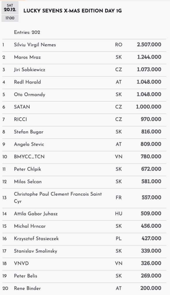 Mit 202 Teilnahmen war Tag 1G der bislang bestbesuchte im Lucky Sevens Main Event. Auch viele Österreicher*innen hatten den Weg über die slowakische Grenze nach Samorin und in den Starttag gefunden. Drei von ihnen schlossen den Flight mit einer Chiptüte ab: Rene Binder schaffte es mit 200.000 als 20. im Chipcount gerade noch so unter die besten 10% des Tages und damit ins Preisgeld. Angelo Stevic brachte es als 9. im Zwischenklassement auf 809.000 und Harald Redl als 4. auf 1.048.000 Chips.