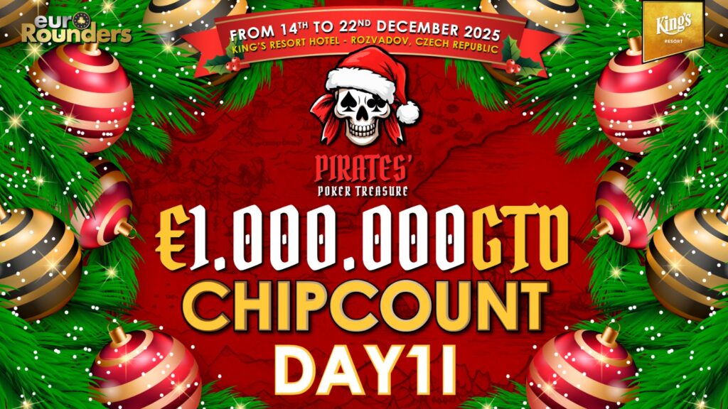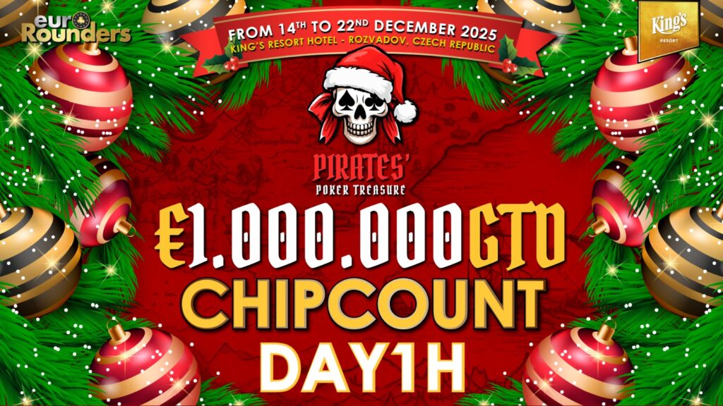 Das Pirates Poker Treasure Christmas Mystery Bounty Festival powered by euroRounders sah am Samstag 709 Entrys im King’s Resort Rozvadov. Trotz zweier passabel besuchter Starttage (1H, 1I) fehlen vor dem heutigen finalen Flight 1J noch rund 1.000 Entrys, um die Garantie von €1.000.000 zu knacken. Ansonsten wird es in Form von einigem Added Value fette Beute für die Freibeuter im Pokerroom King’s geben. Die gab es an Tag 1 bereits in Form des €600 Min-Cashes für 89 Überlebend. Die beiden erfolgreichsten Jetonsammler konnten sich außerdem den €1.150 Chipleader Bonus schnappen!