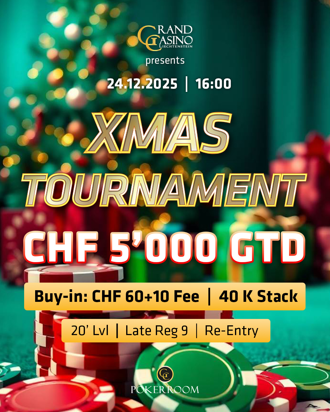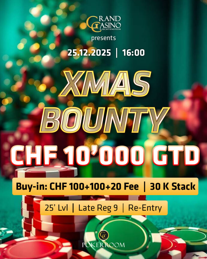 Mit dem 5.000 CHF gtd. Xmas Tournament fand an Heiligabend das erste von zwei speziellen Weihnachtsevents im Grand Casino Liechtenstein (GCLI) statt. 73 Entrys verbrachten die Bescherung in dem GC Pokerroom-Turnier und sorgten dafür, dass die Garantie geknackt wurde. Am Ende sollte sich ein Trio die größten Geschenkpakete teilen!