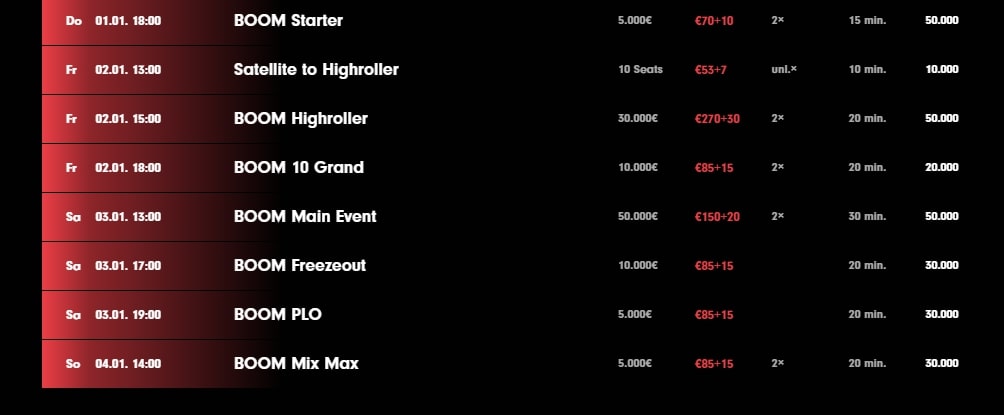 Beim BOOM-Festival vom 1. Januar bis 5. Januar stehen sieben Turniere auf dem Programm, die mit Preisgeldgarantien von insgesamt €115.000 dotiert sind.