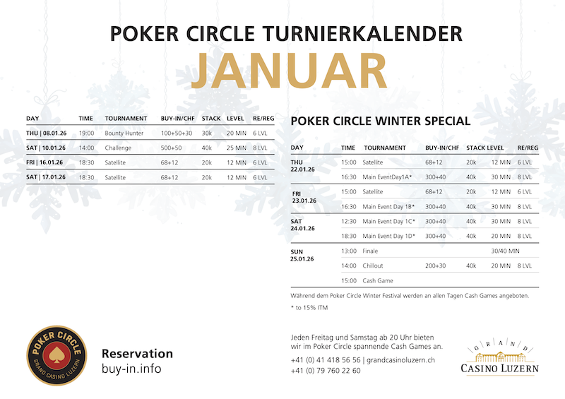 Der Januar im Poker Circle im Grand Casino Luzern hat es in sich. Der Monat startet mit regulären Turnieren und in der zweiten Monatshälfte gibt es die Poker Circle Winter Special Serie vom 22. bis 25. Januar.
