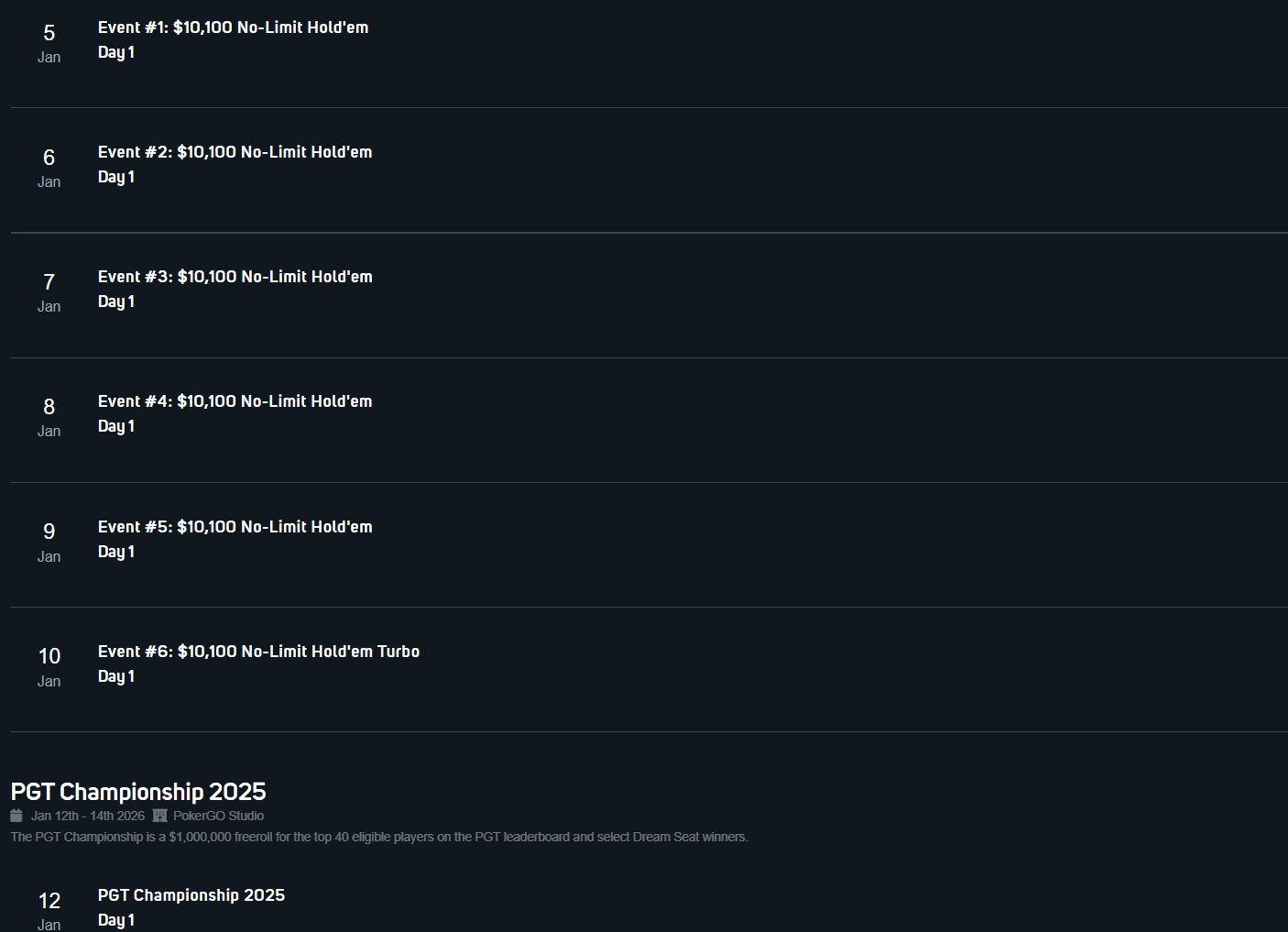 Die PGT Last Chance läuft vom 5. Januar bis 10. Januar im Aria von Las Vegas und es wird täglich ein $10.100-Turnier gestartet, das dann am Folgetag entschieden wird.