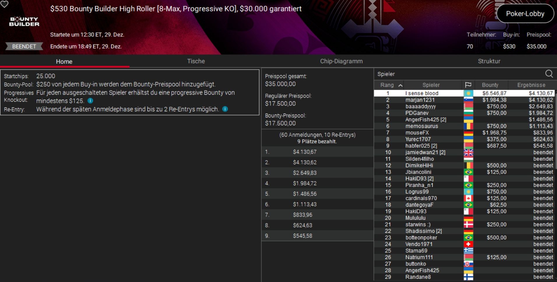 Weniger gut lief es bei den Highrollern. Hier gingen die Siege an „I sense blood“ aus Kasachstan und „habfer025“ aus Belarus, die sich beim $530 Bounty Builder bzw. $320 Supersonic durchsetzen konnten.