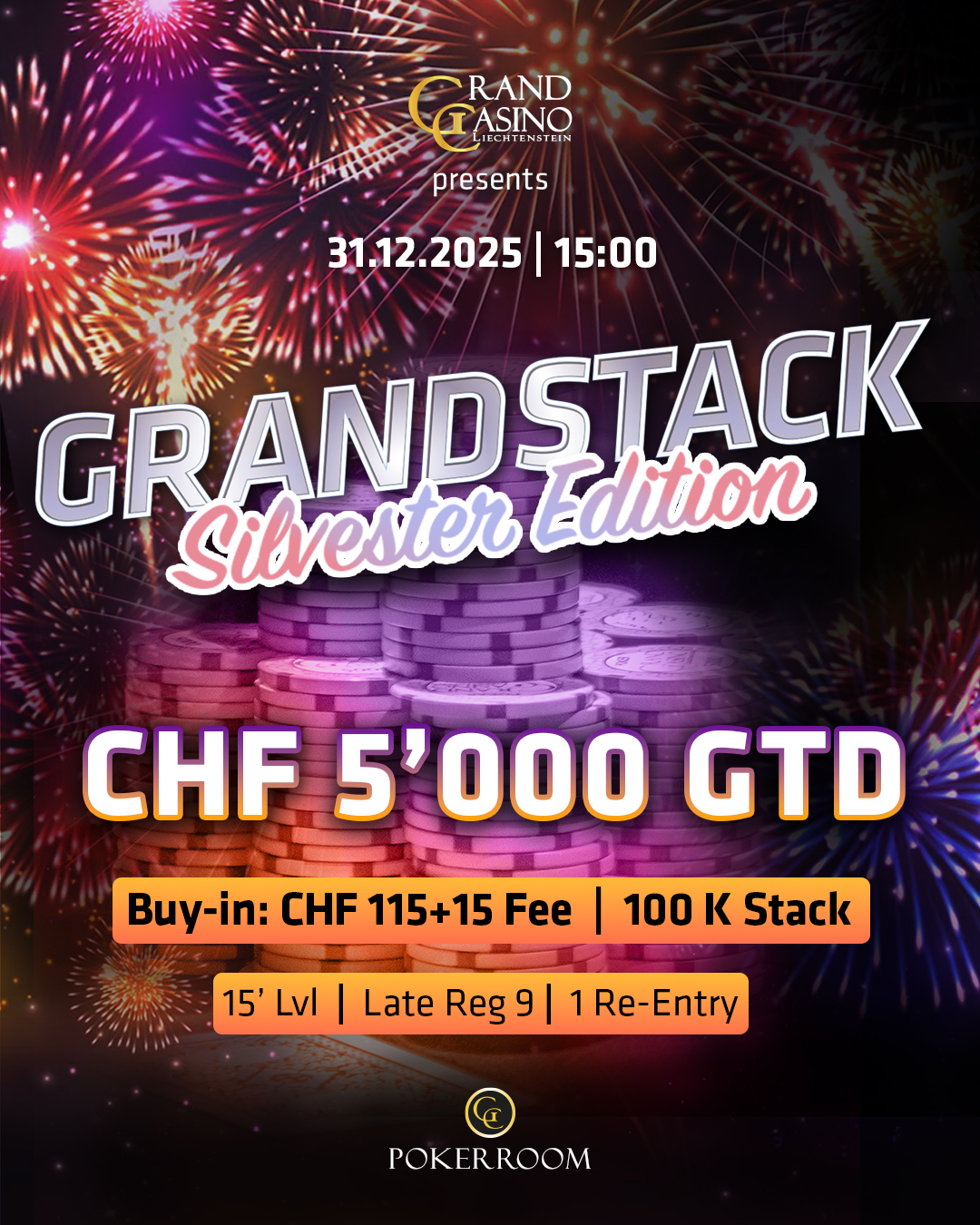 Heute steht im GCLI um 15:00 Uhr das letzte Turnier des Jahres auf dem Programm mit dem CHF 115+15 Grand Stack in der Silvester Edition mit einer CHF 5.000 Garantie, einem 100.000 Start Stack und 15 Minuten Blind Levels.