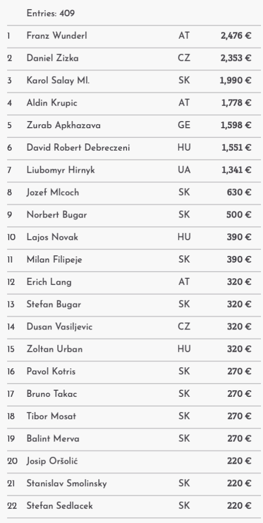409 Entries konnten verzeichnet werden und somit wurde um einen Preispool von €20.797 gespielt. Dieser wurde auf die Top 34 Spieler verteilt. Der Min-Cash betrug €145 und nach einem 7-way Deal gab es einen Top-Preis von €2.476.