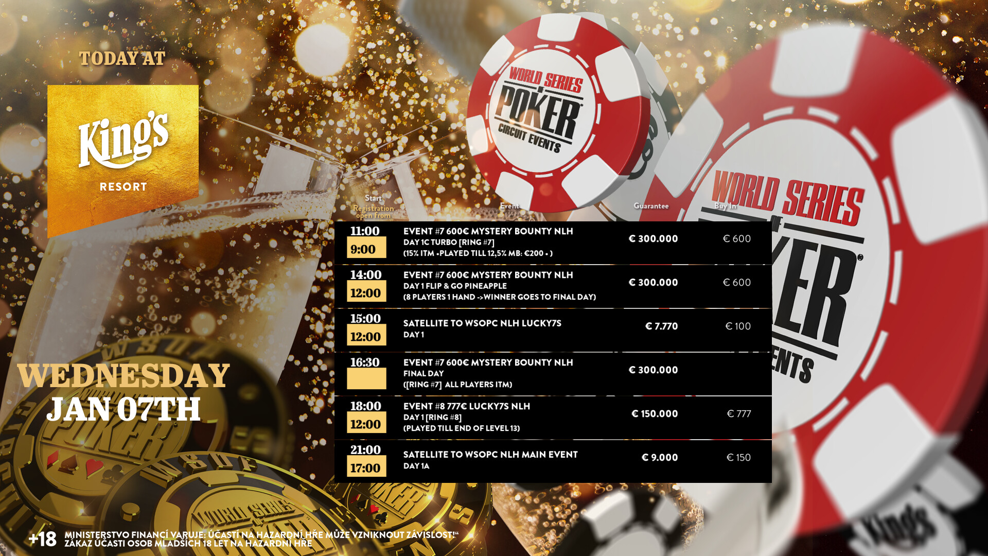 Im King’s Resort Rozvadov stand am Dienstag beim World Series Of Poker Circuit Tag 1B des Event #7: €600 Mystery Bounty NLH mit einer €300.000 Garantie auf dem Turnierplan.