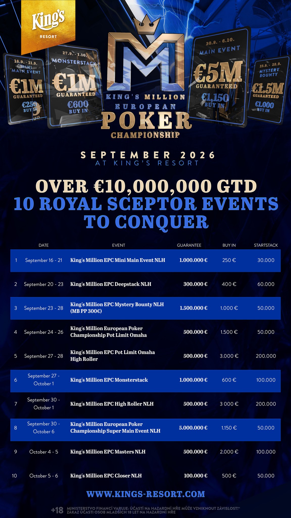 Im September steht im King’s Resort im Rozvadov mit der King’s MILLION European Poker Championship im September mit gigantomanischen €10.000.000 Garantie! mit zehn Mega-Events auf dem Programm, die insgesamt Preisgelder mit mehr als €10.000.000 ausspielen werden.