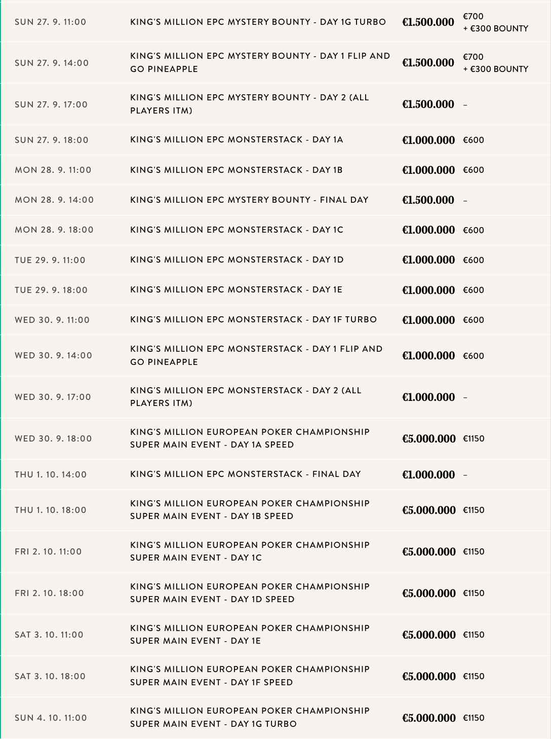 Komplementiert wird das Programm mit einem Lowstakes €400 Deepstack NLH mit €300.000 Garantie zu Anfang des Events (20.—23.09.) sowie einem €500 Closer mit €100.000 Garantie zum Abschluss (05.—06.10.).