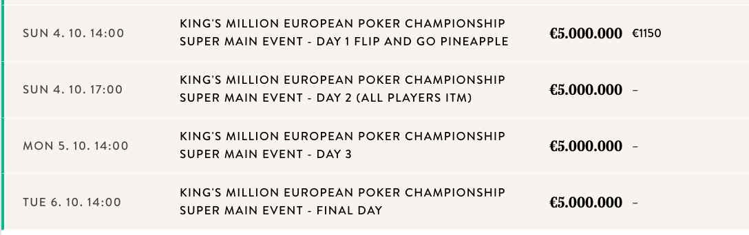Dazu kommen drei Events mit mehr als €1.000.000 Garantie. Das €250 Mini Main Event mit €1 Mio. gibt es gleich zum Start vom 16. bis zum 21. September. Auch hier gibt es sieben Startflights plus Flip&Go’s, aber nur drei Spieltage.