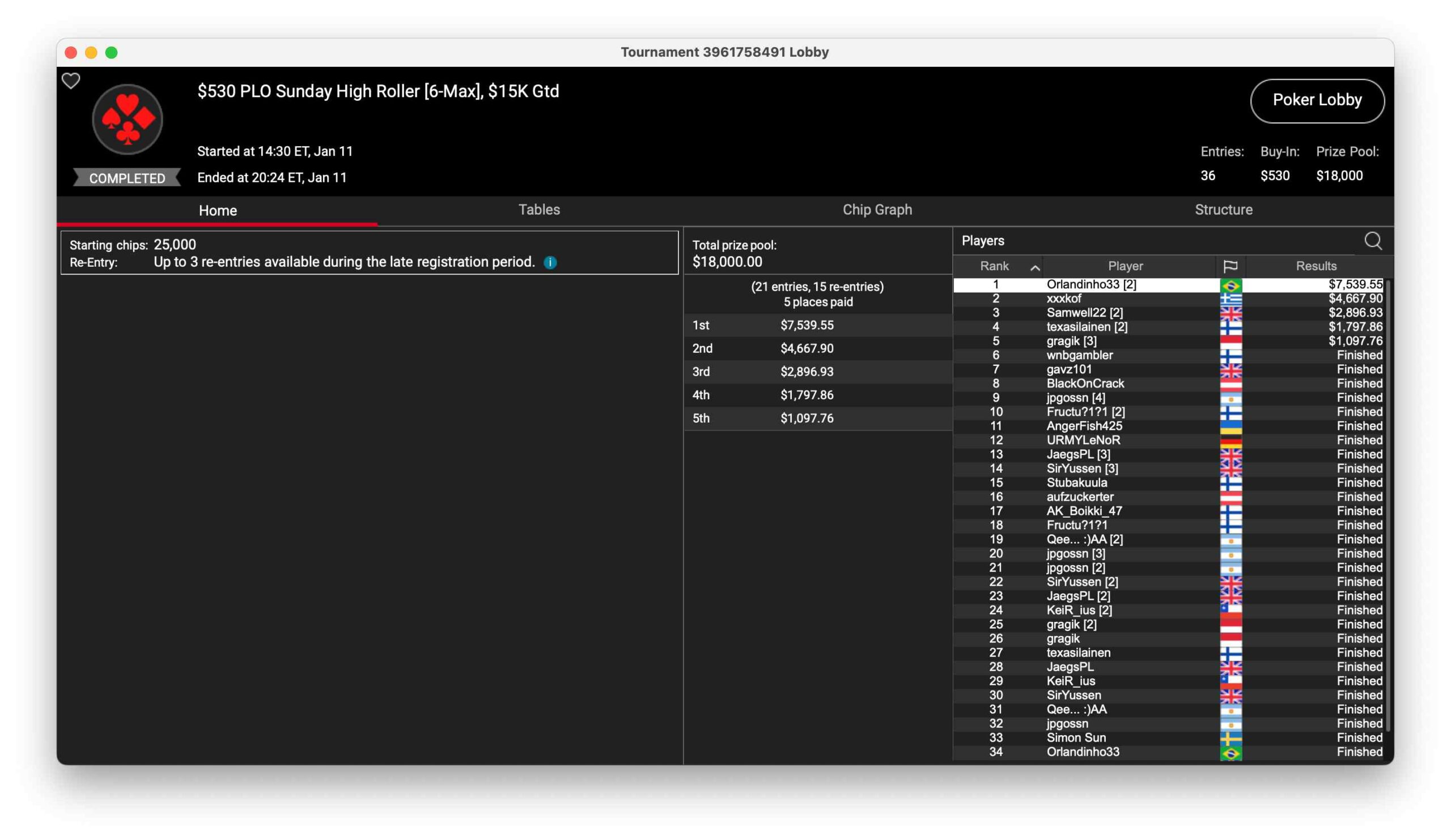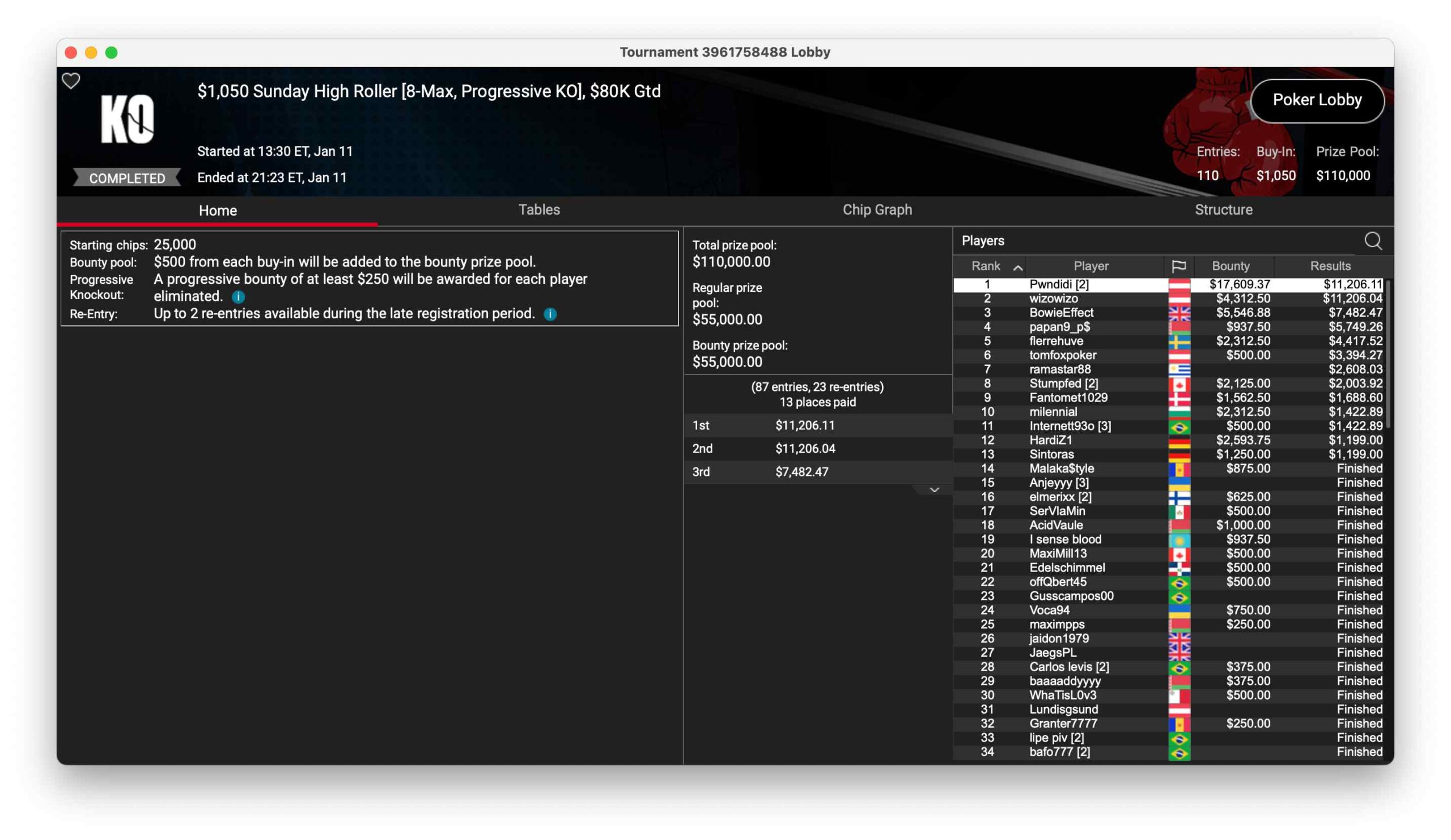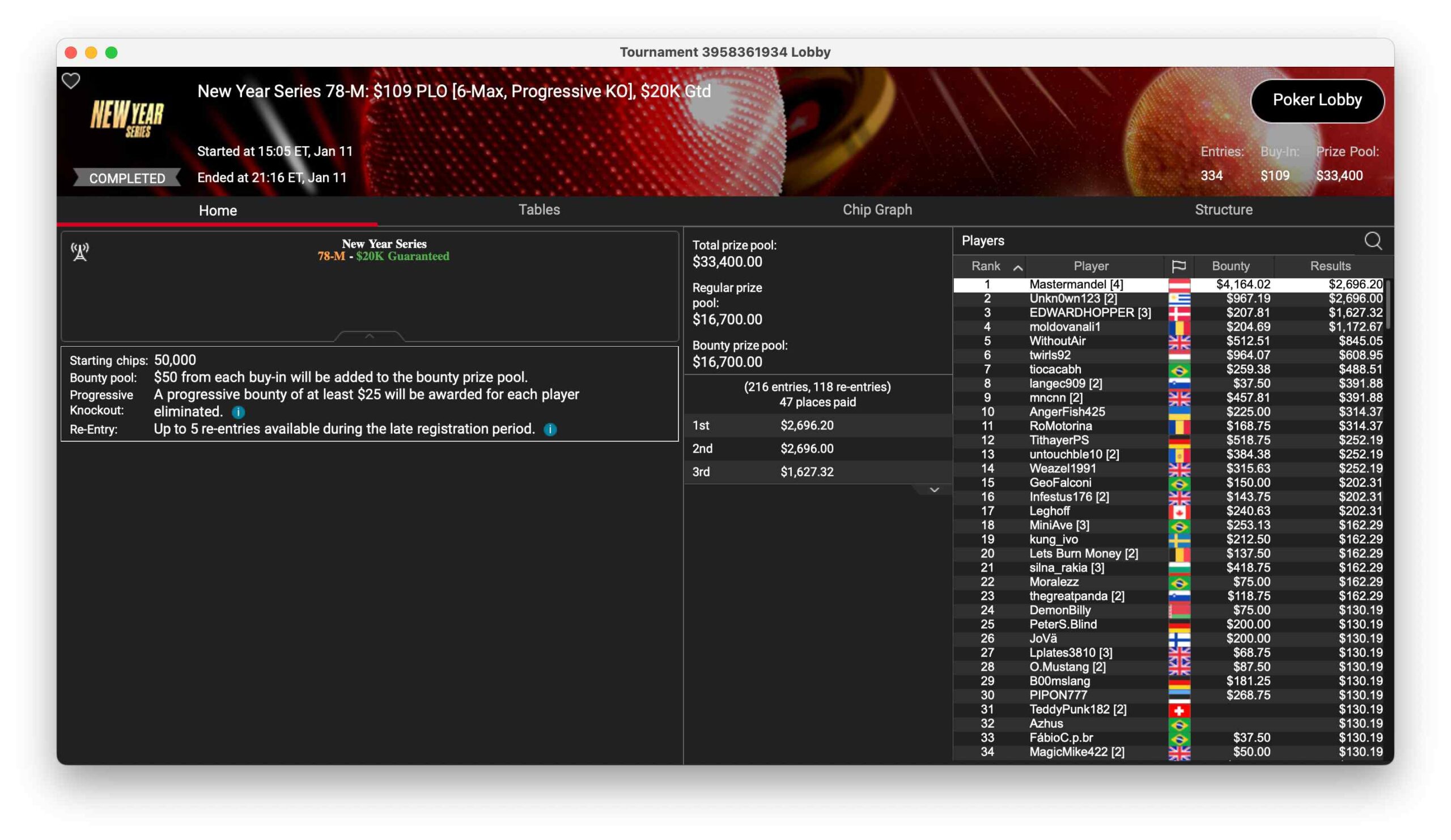 „Mastermandel“ aus Österreich sicherte sich das $109 PLO 6max PKO mit 334 Entries und $33.400. Der Sieg war mit $4.164 + $2.696 belohnt worden.