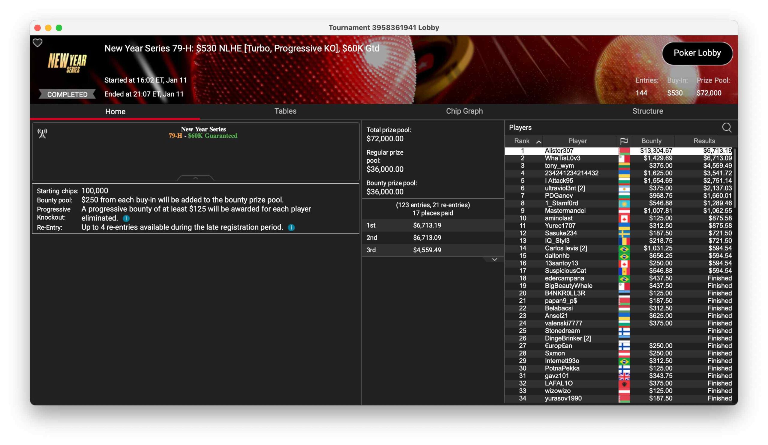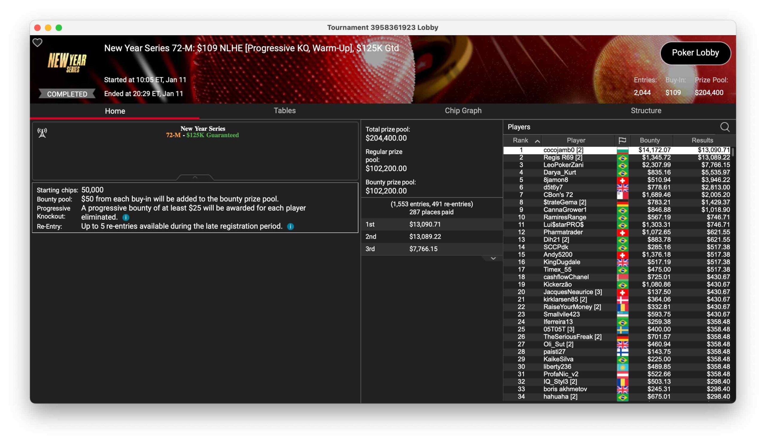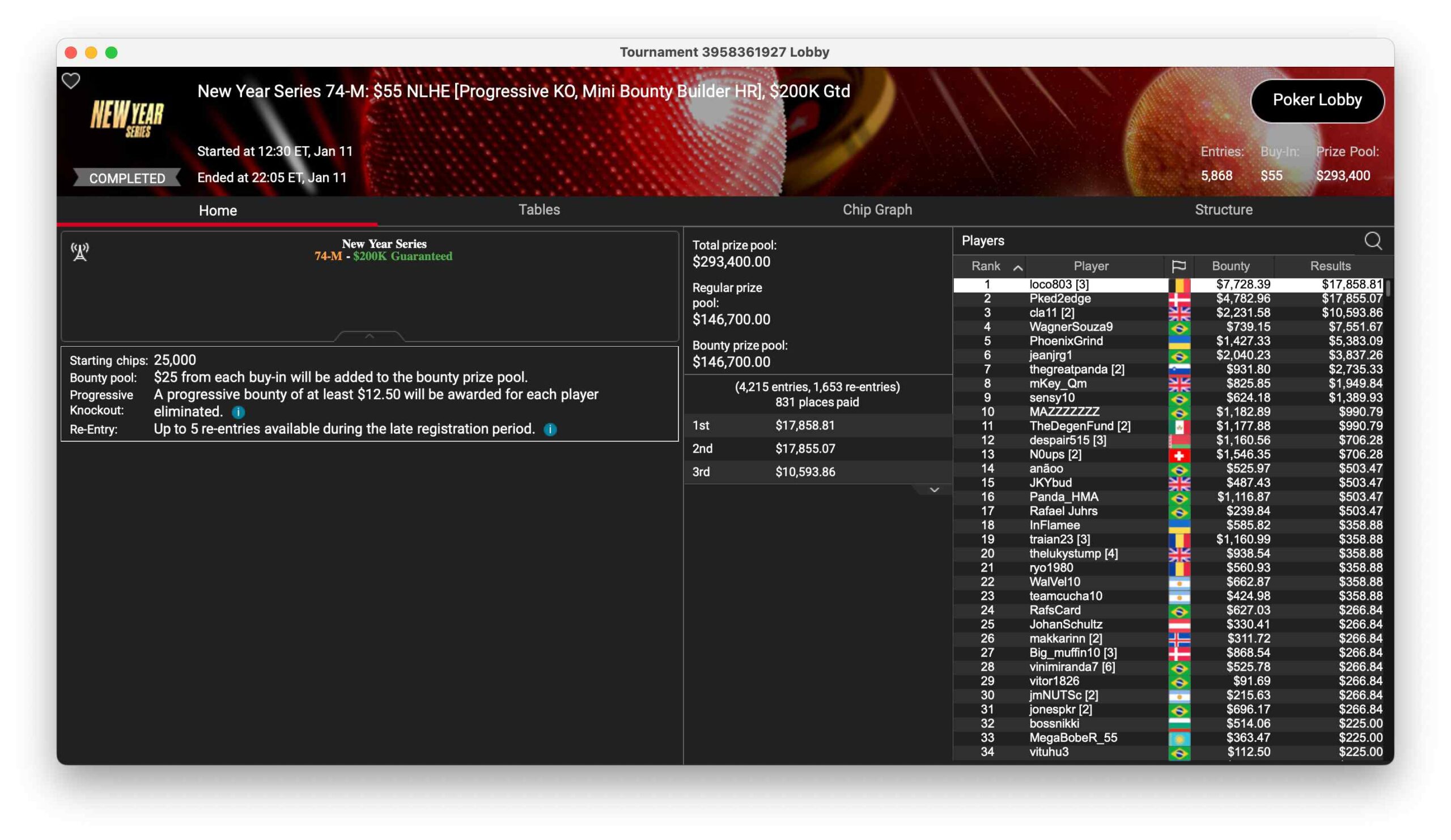 „Mastermandel“ aus Österreich sicherte sich das $109 PLO 6max PKO mit 334 Entries und $33.400. Der Sieg war mit $4.164 + $2.696 belohnt worden.