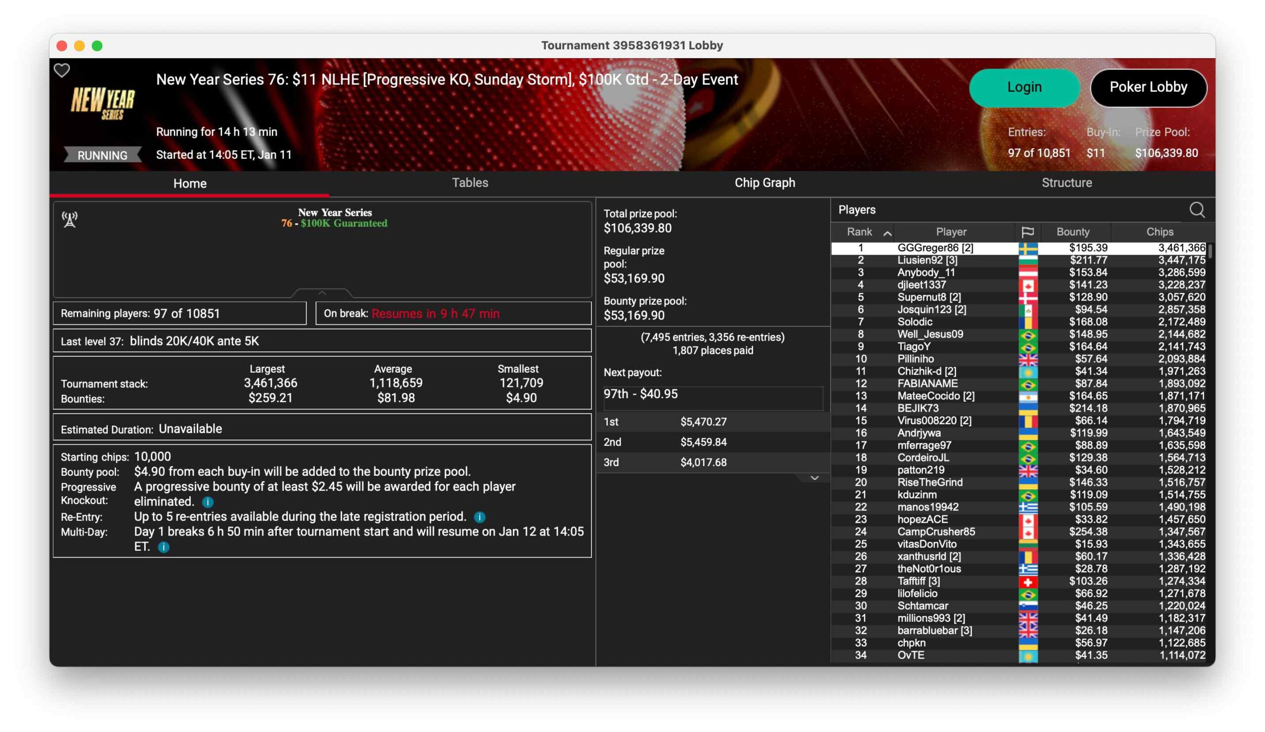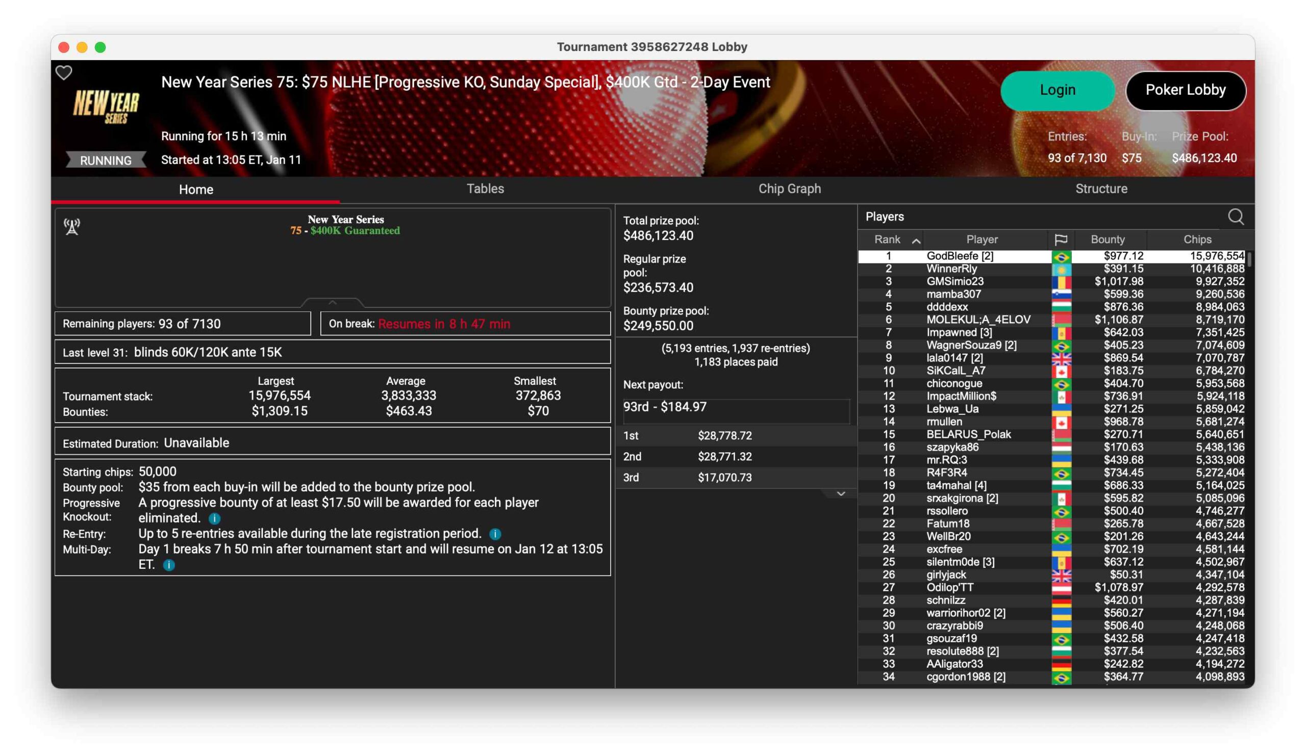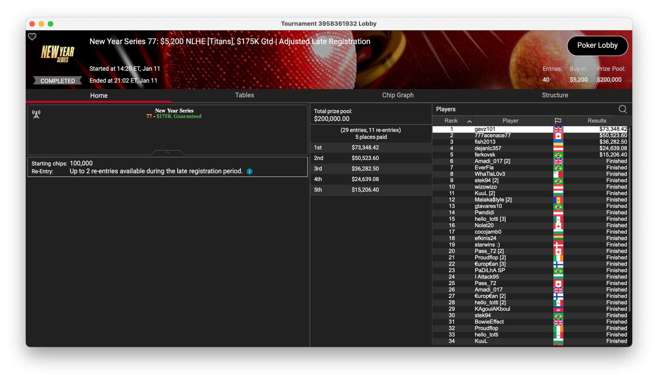 Das größte Turnier des Tages war das $5.200 NLHE Titans mit 40 Entries und $200.000 Preispool. Den Sieg holte der Brite „gavz101“ für $73.348.