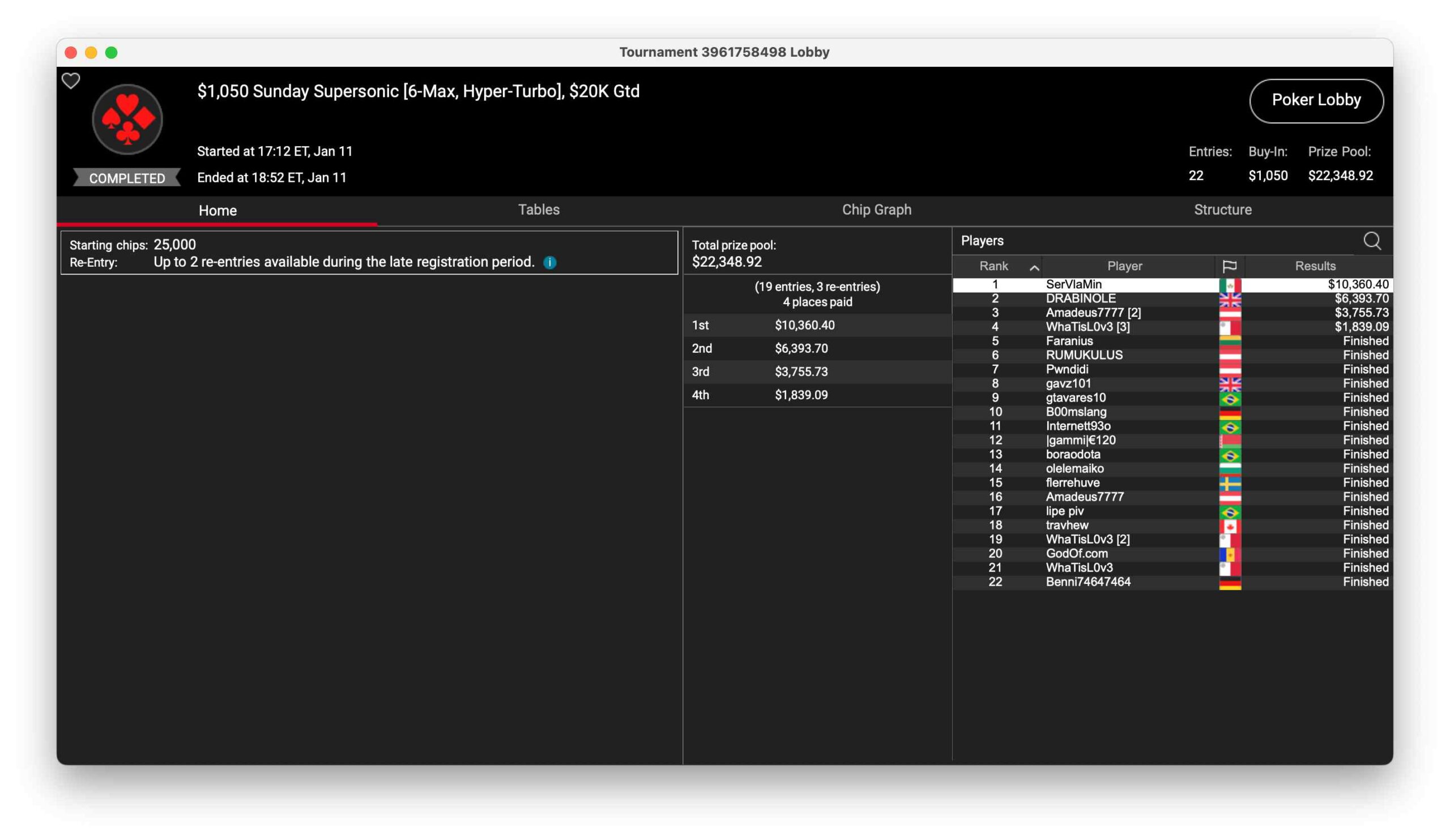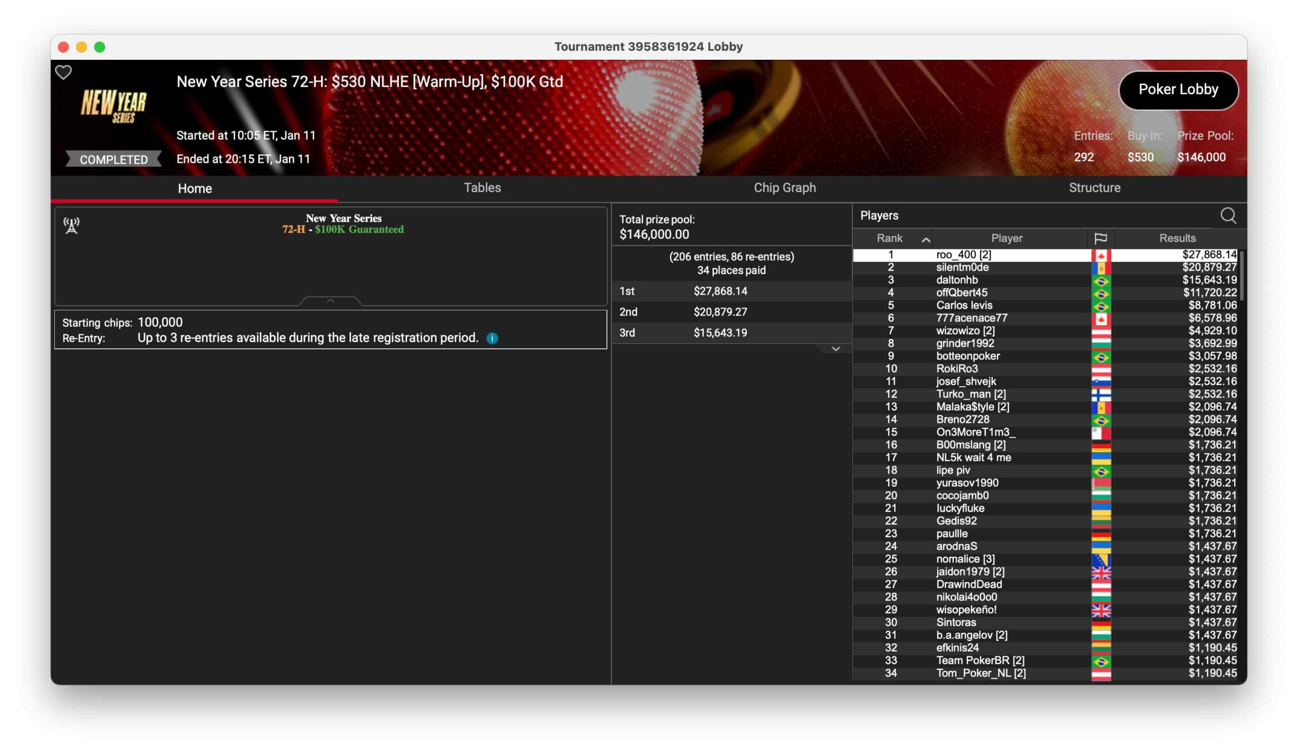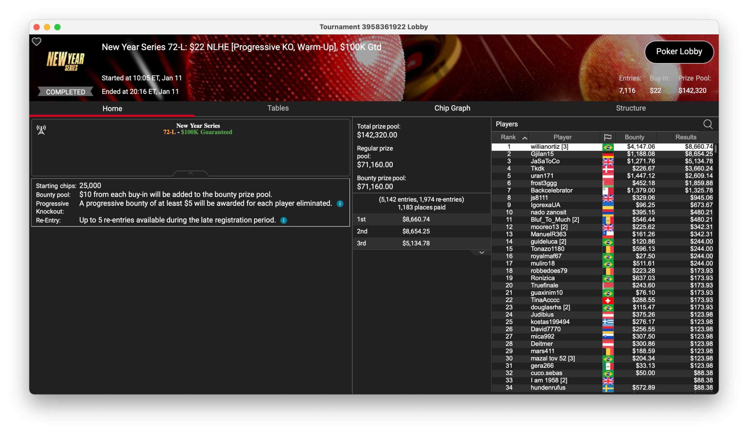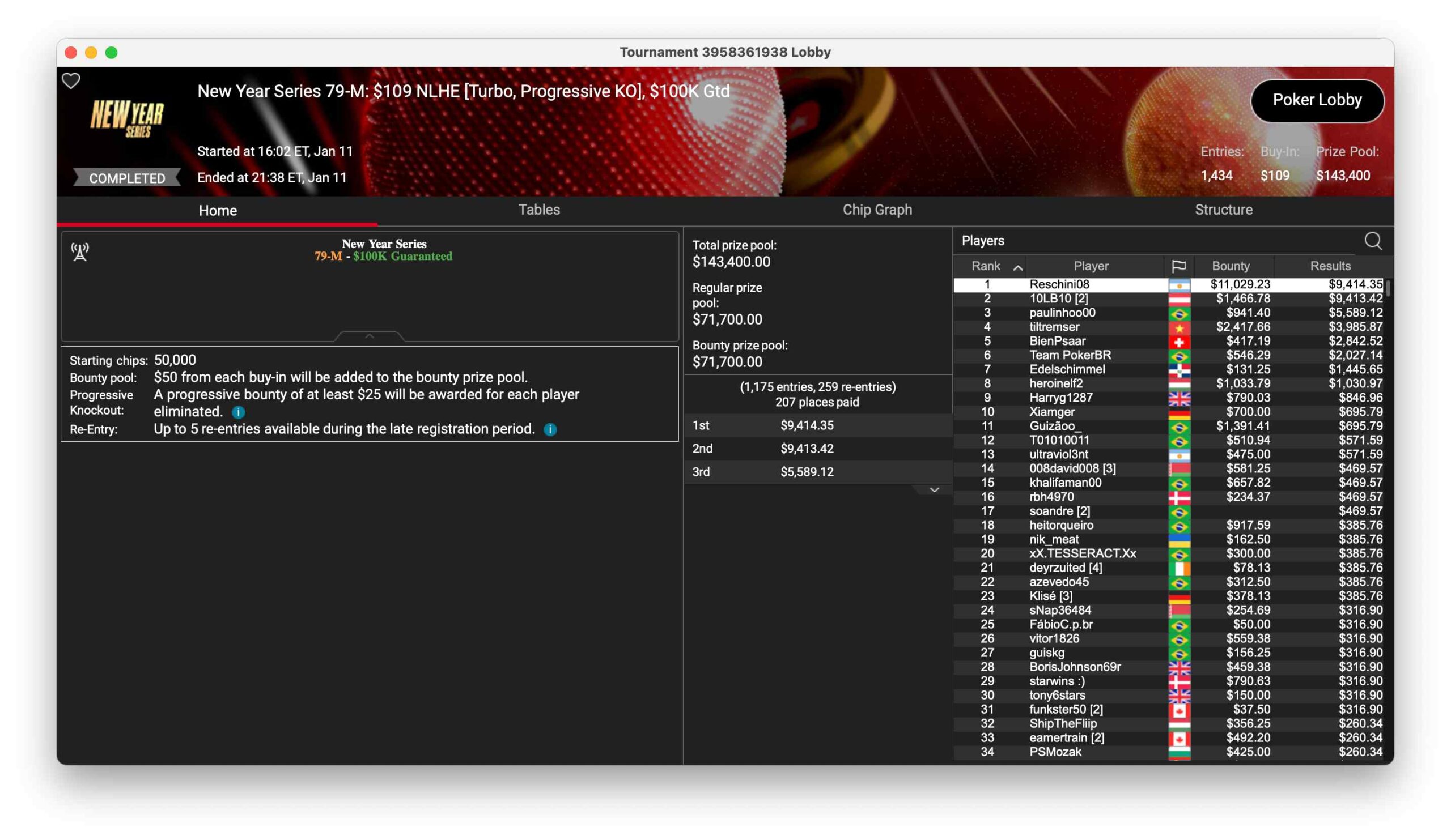 Das größte Turnier des Tages war das $5.200 NLHE Titans mit 40 Entries und $200.000 Preispool. Den Sieg holte der Brite „gavz101“ für $73.348.