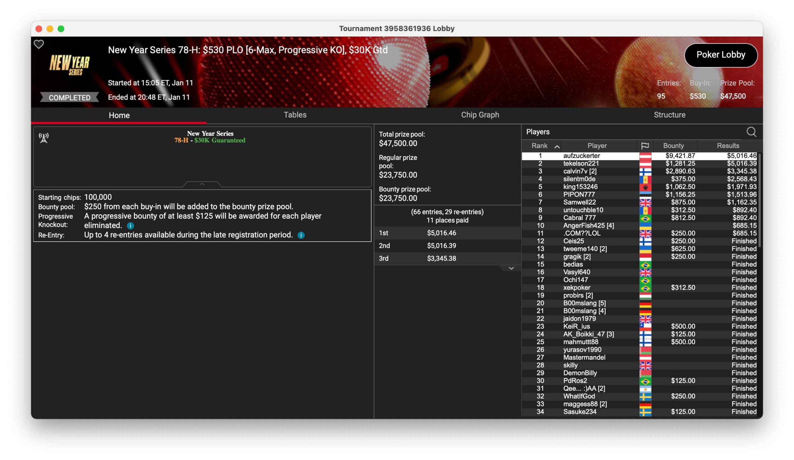 95 Entries waren im $530 PLO 6max PKO mit dabei, $47.500 lagen hier im Pott. Der Österreichische PokerStars-Grinder „aufzuckerter“ gewann für $9.421 + $5.016. Sein Landsmann „tekelson221“ wurde Runner-Up für $1.281 + $5.016.
