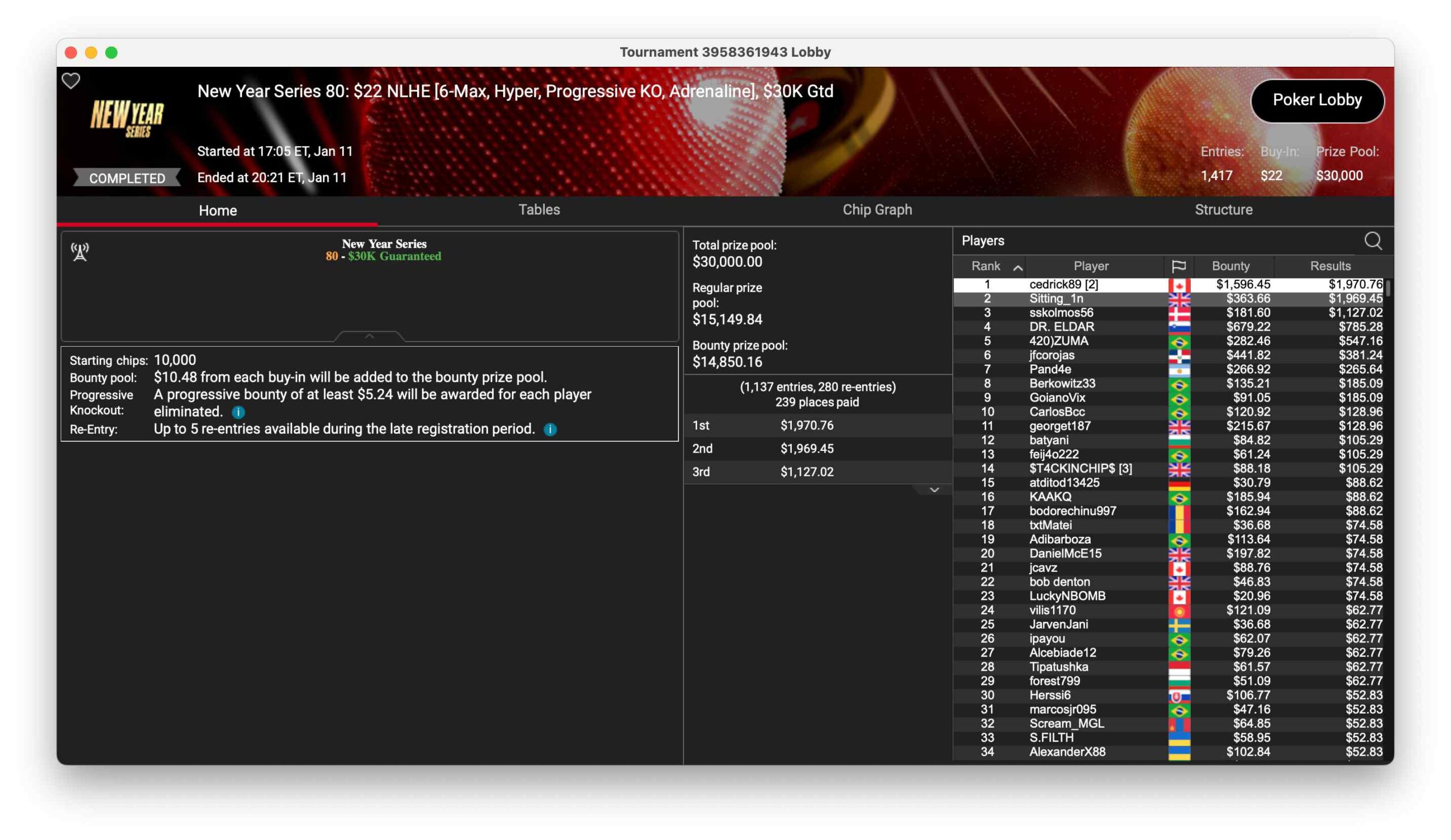 Der PokerStars-Dauergast „Sintoras“ holte das $530 NLHE PKO (Bounty Builder HR) mit 242 Entries und $121.000 Preispool. Platz 1 brachte $10.236 ein, mit Bounties konnte „Sintoras“ $15.843 einsammeln. Runner-Up „HisUdeness“ aus Deutschland ging mit $2.179 + $10.235.