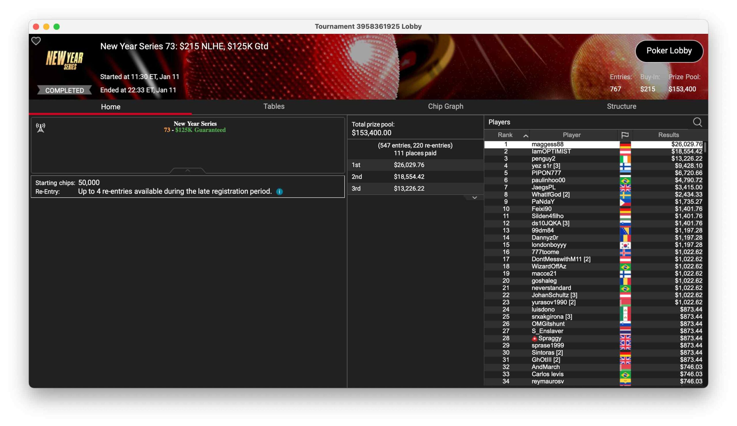 Im $215 NLHE waren 767 Entries am Start, $153.400 kamen im Pott zusammen. Der deutsche Grinder „maggess88“ holte den Sieg für $26.029.