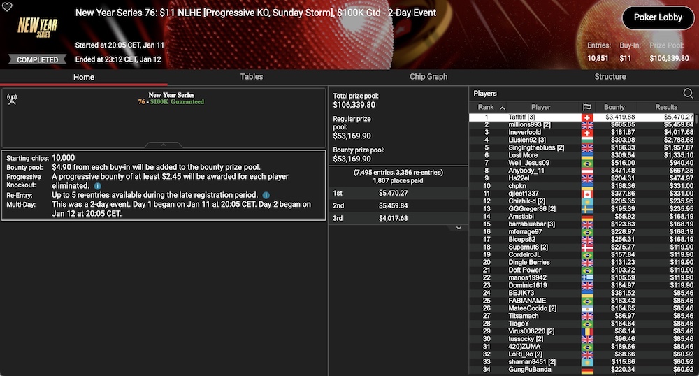 Und zu guter Letzt hatten wir das New Year Series 76: $11 NLHE PLO Sunday Storm, das 10.851 Entries an die Tische lockte. Der $106.339 Preispool wurde auf die Top 1.807 Teilnehemr verteilt und es war der schweizer Spieler ‚Tafftiff‚, der sich über den größten Antiel in Form von $5.470 plus $3.419 an Bounties freuen konnte. Auch auf Platz 3 fanden wir einen Schweizer mit ‚Ineverfoold‘, der dafür $4.017 plus $181 an Bounties kassierte.