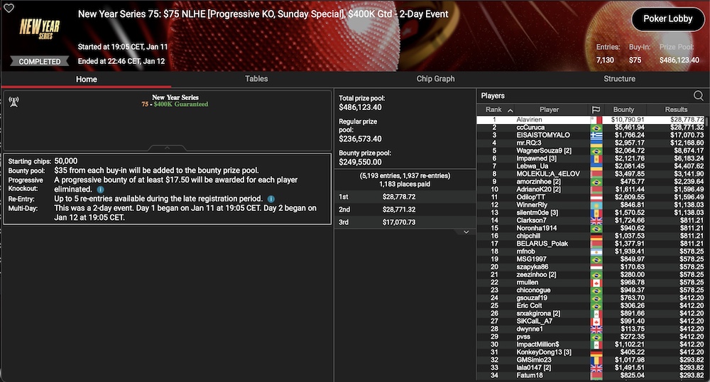 Im New Year Series 75: $75 NLHE PKO Sunday Special ($400k GTD) gab es 7.130 Anmeldungen und somit einen $486.123 Preispool. Dieser wurde auf 1.183 Spieler verteilt und der größte Anteil von $28.788 plus $10.790 an Bounties ging an den Malteser ‚Alavirien‚.